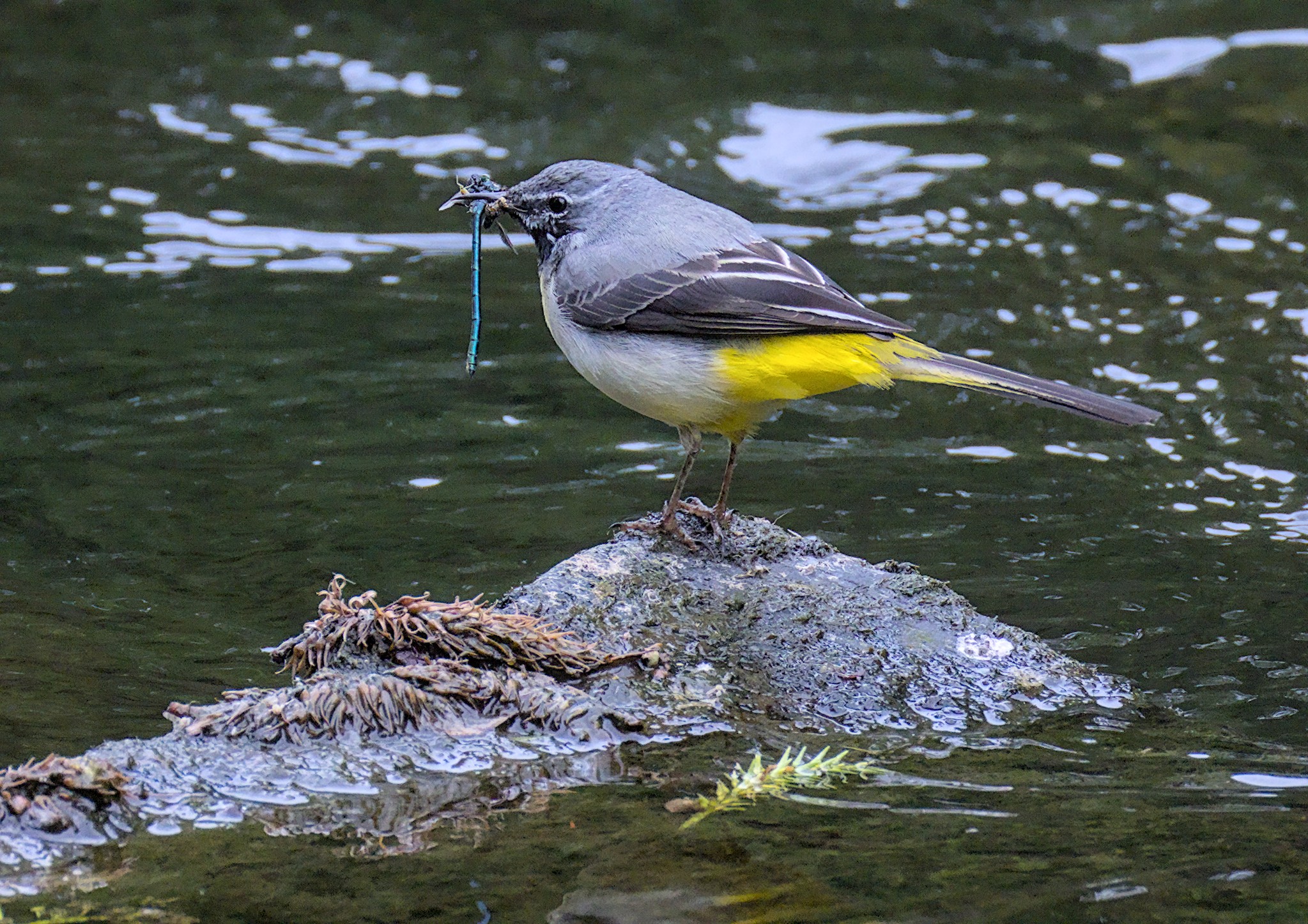 I watched the Grey Wagtails across the other side of the river while near the Lower Holme footbridge. They kept catching Mayflies and one has a Damselfly. I then noticed that they weren’t eating them themselves but were calling and just moving a small distance up and then down river, but with no young to feed. So I moved so that I was partly hidden by foliage and the bridge. The birds then flew across to near where I was standing and then up behind leaves to feed young on a nest I guess.