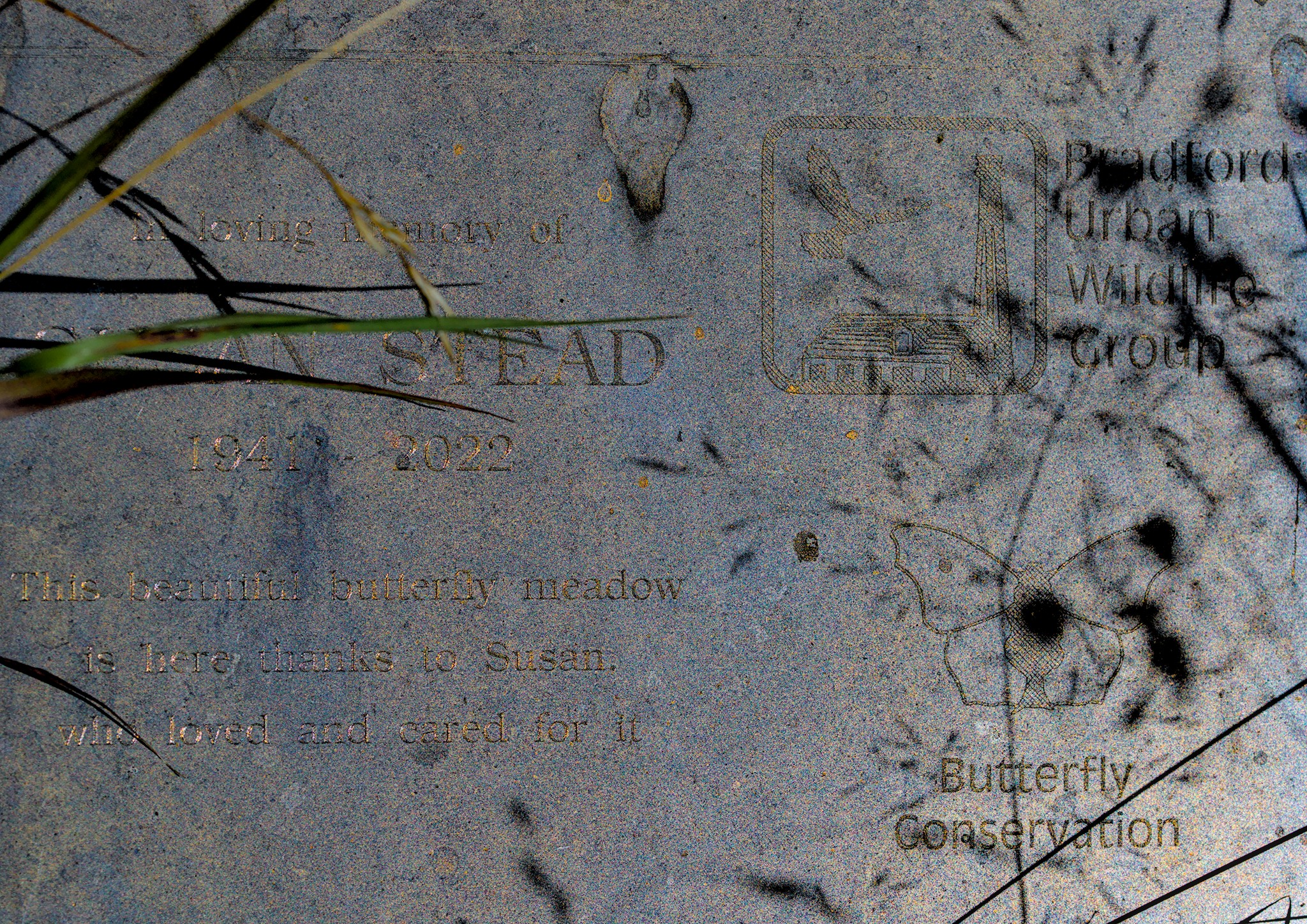 On this visit to the Shipley Station Butterfly Meadow I didn’t spot any Burnet or Cinnabar Moths or their caterpillars. I did see several Small Skippers though and a couple of Grasshopper varieties. This time I did take a closer look at the Susan Stead memorial plaque
