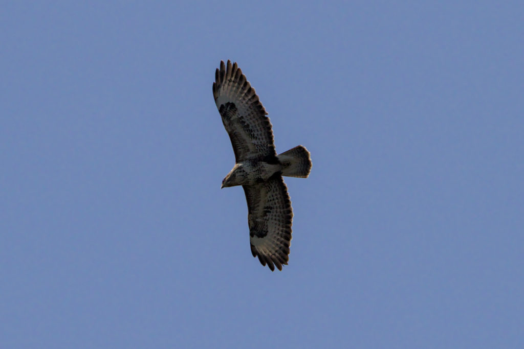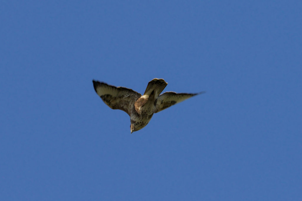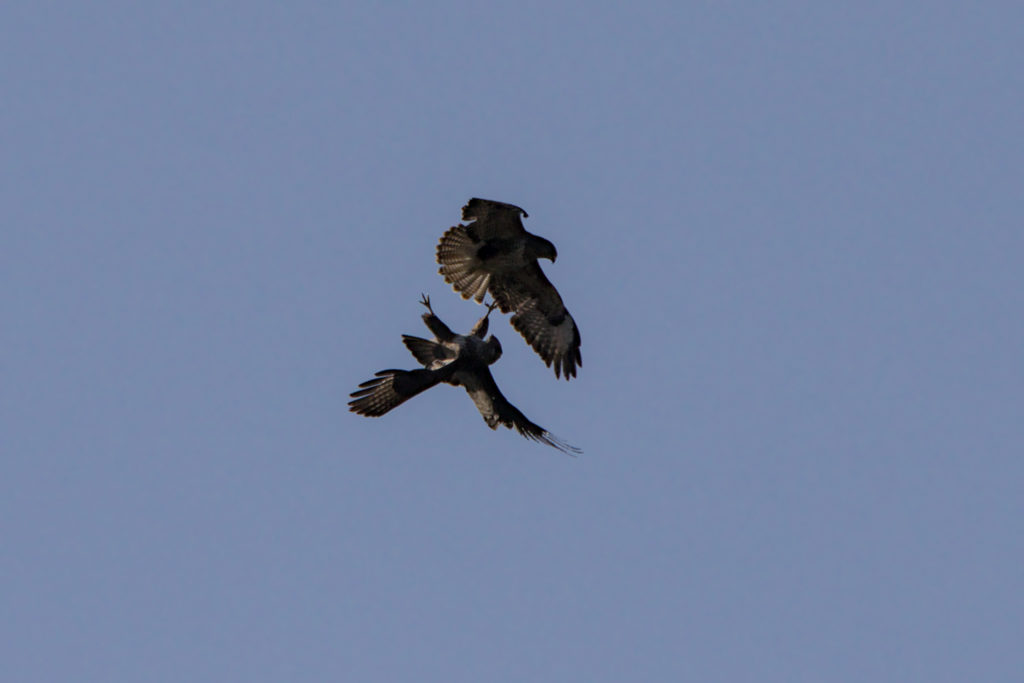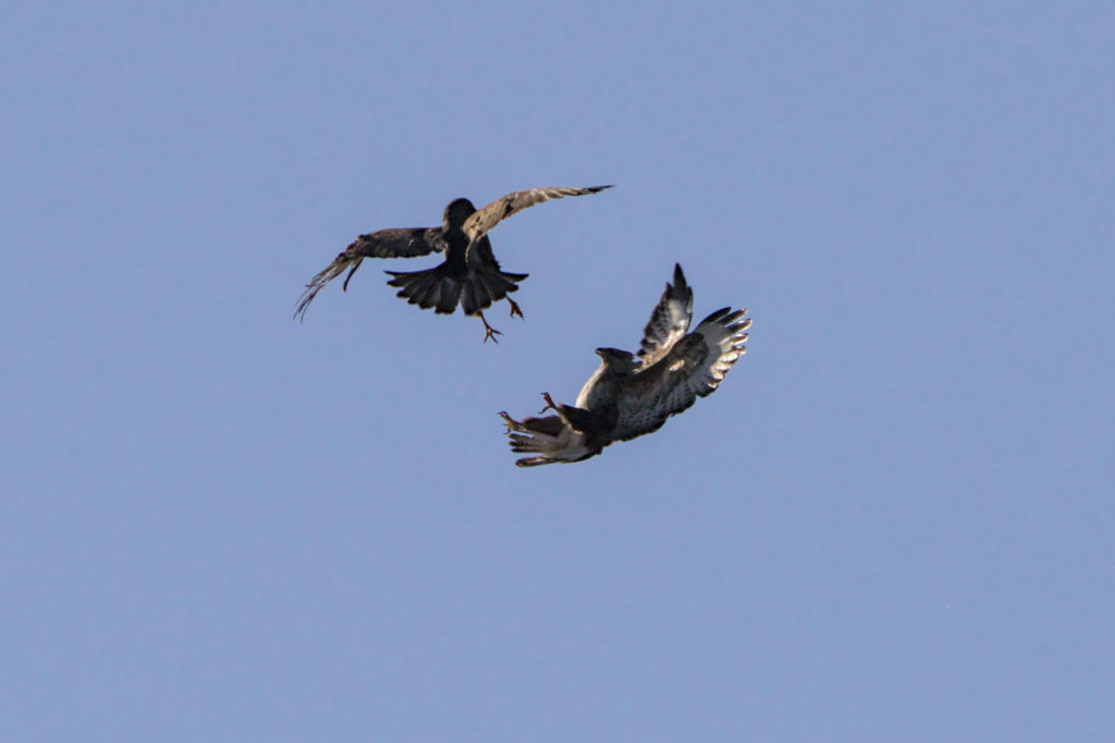 I spotted another large bird and at first thought it was the Red Kite I had seen, but as it flew around and came a bit closer I noticed it didn’t have the tail shape for a Red Kite. And then there were two of them. I have heard of birds passing food from one to the other during the breeding season in this kind of dance but these had no food to share and looked as though they were trying to get their talons into each other.