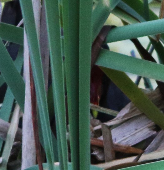 Anyway I was pleased to see a Moorhen slowly come back to the nest and clamber aboard. You can see some of the black Moorhen and and the red on its beak just behind and to the right of that centre set of stalks.