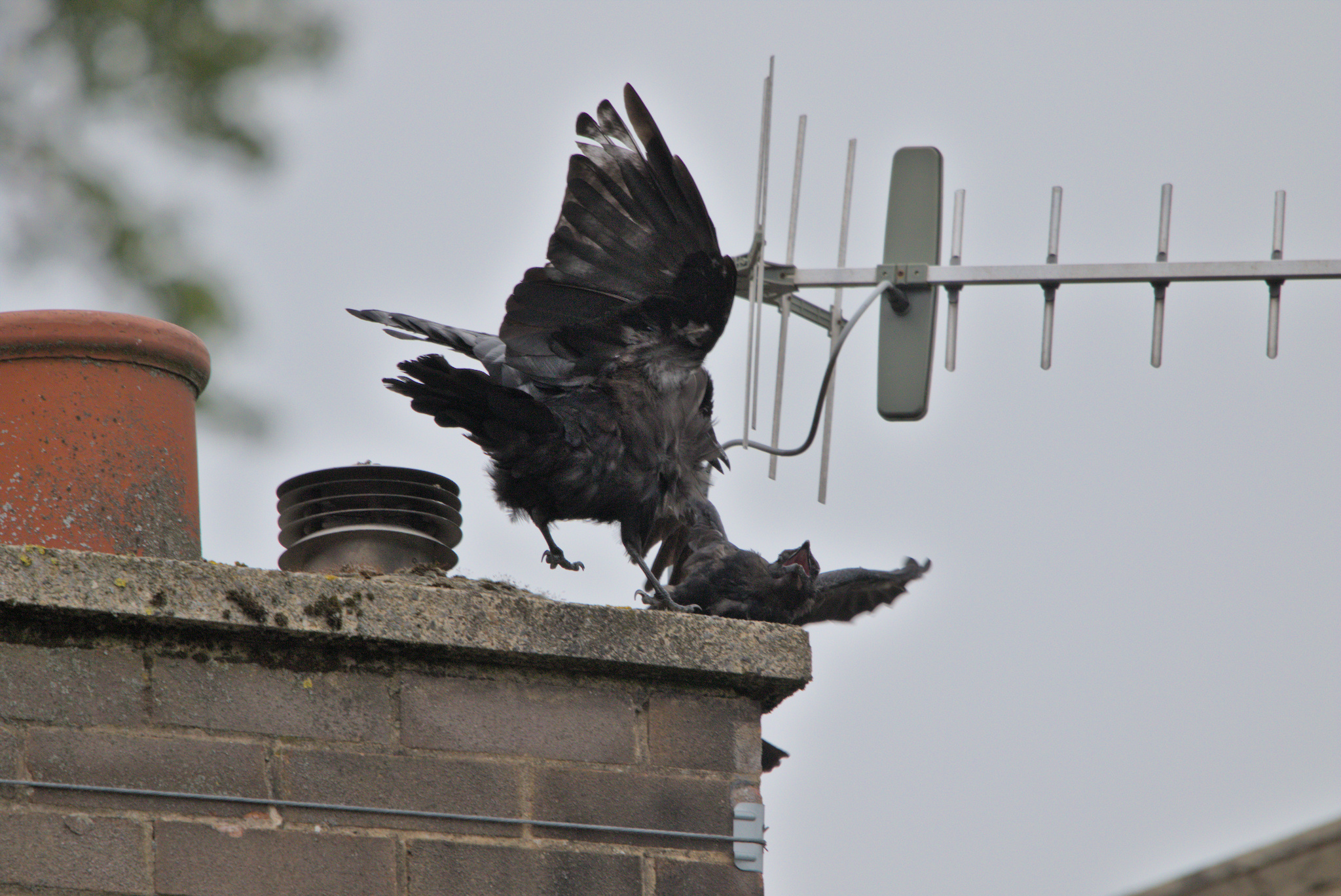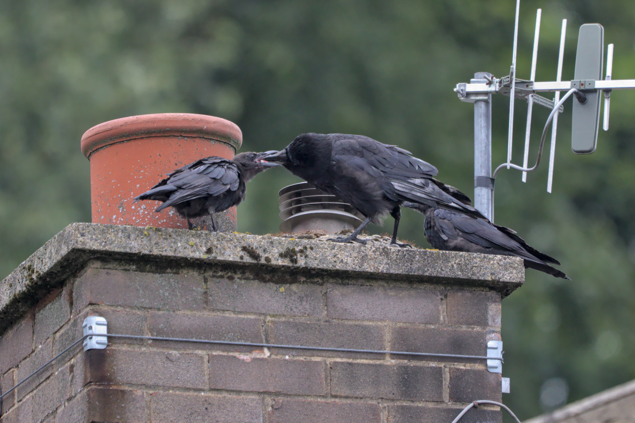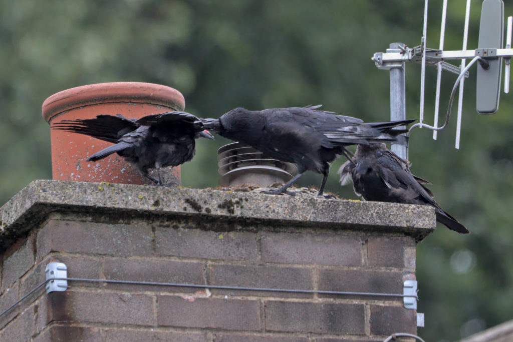 I did think that by the middle of September that all that would be finished with but a noisy youngster was still shouting to be fed; this time on a neighbour’s chimney. The one on the left was fed by the adult and it looks like a risky business; shoving a hard beak into each other. No harm was done, but the youngster on the right, after making a bit of a fuss, was seen off by the adult in quite a rough way.