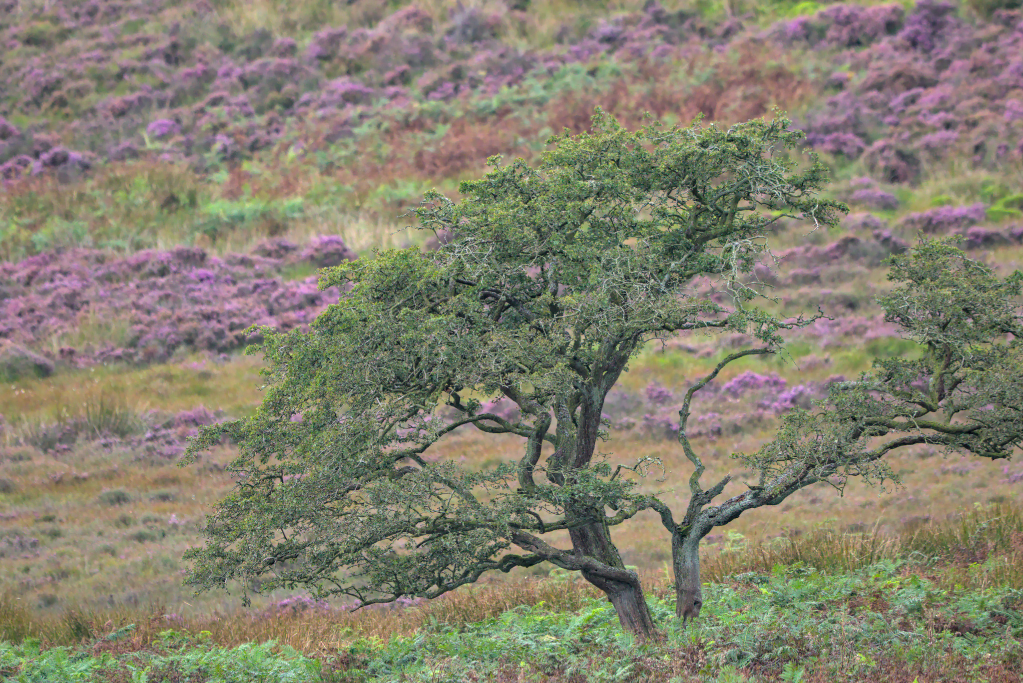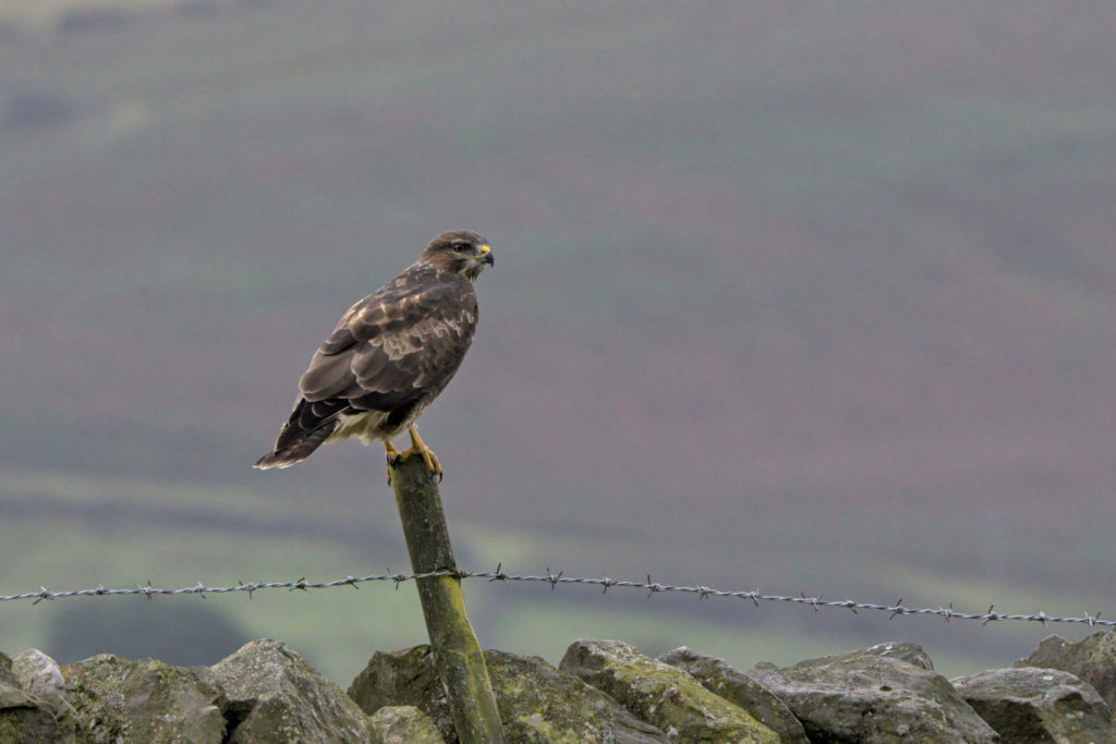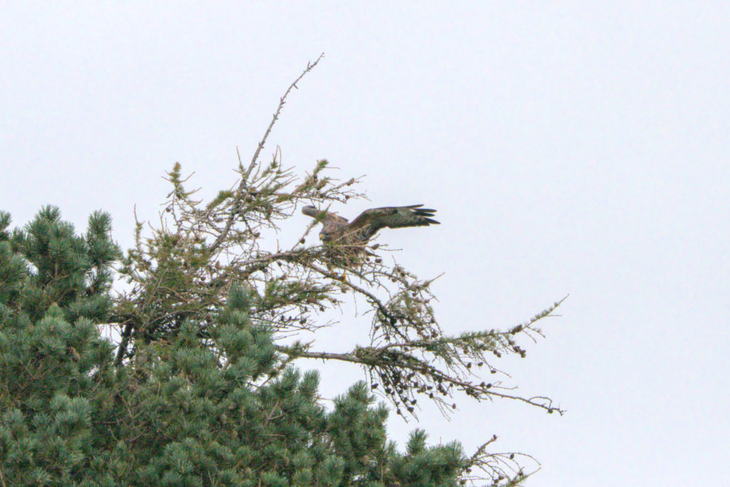 As part of this drive around I had my camera with me and was very pleased I did. When on Hardisty Hill I spotted a Buzzard on a fence post. It took me a few minutes to find somewhere I could safely stop the car so I could get out with my camera. The Buzzard posed for a few minutes before flying down to the tree in the heather. At the same time I heard another Buzzard behind me, this one flew along some trees before settling in one of them.