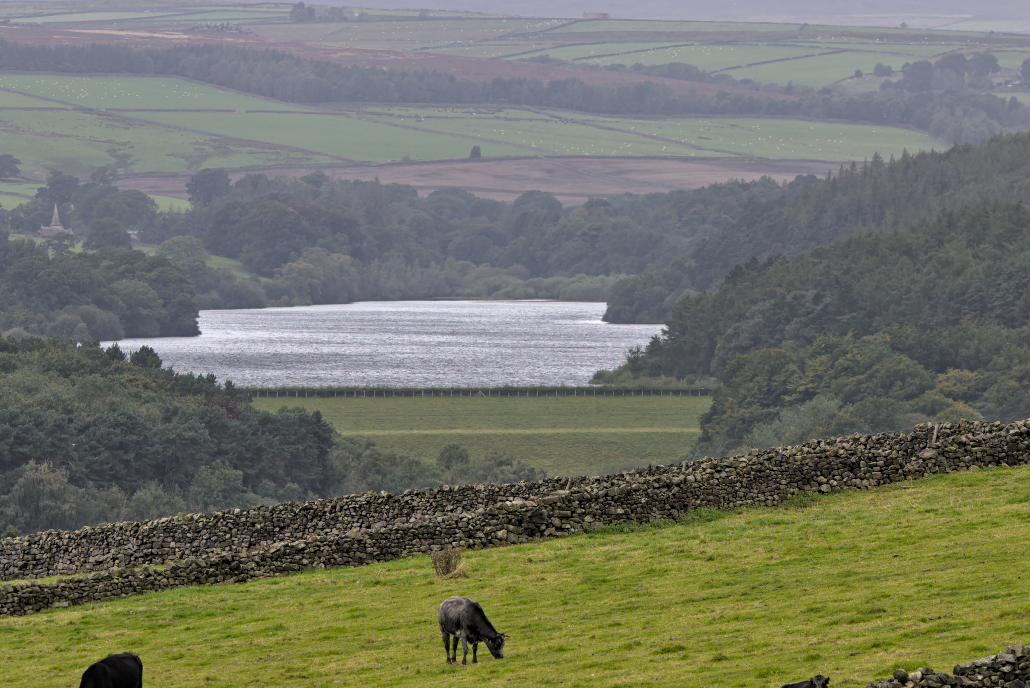 Swinsty Reservoir. St Andrews Church on the left. From Brame Lane, B6451