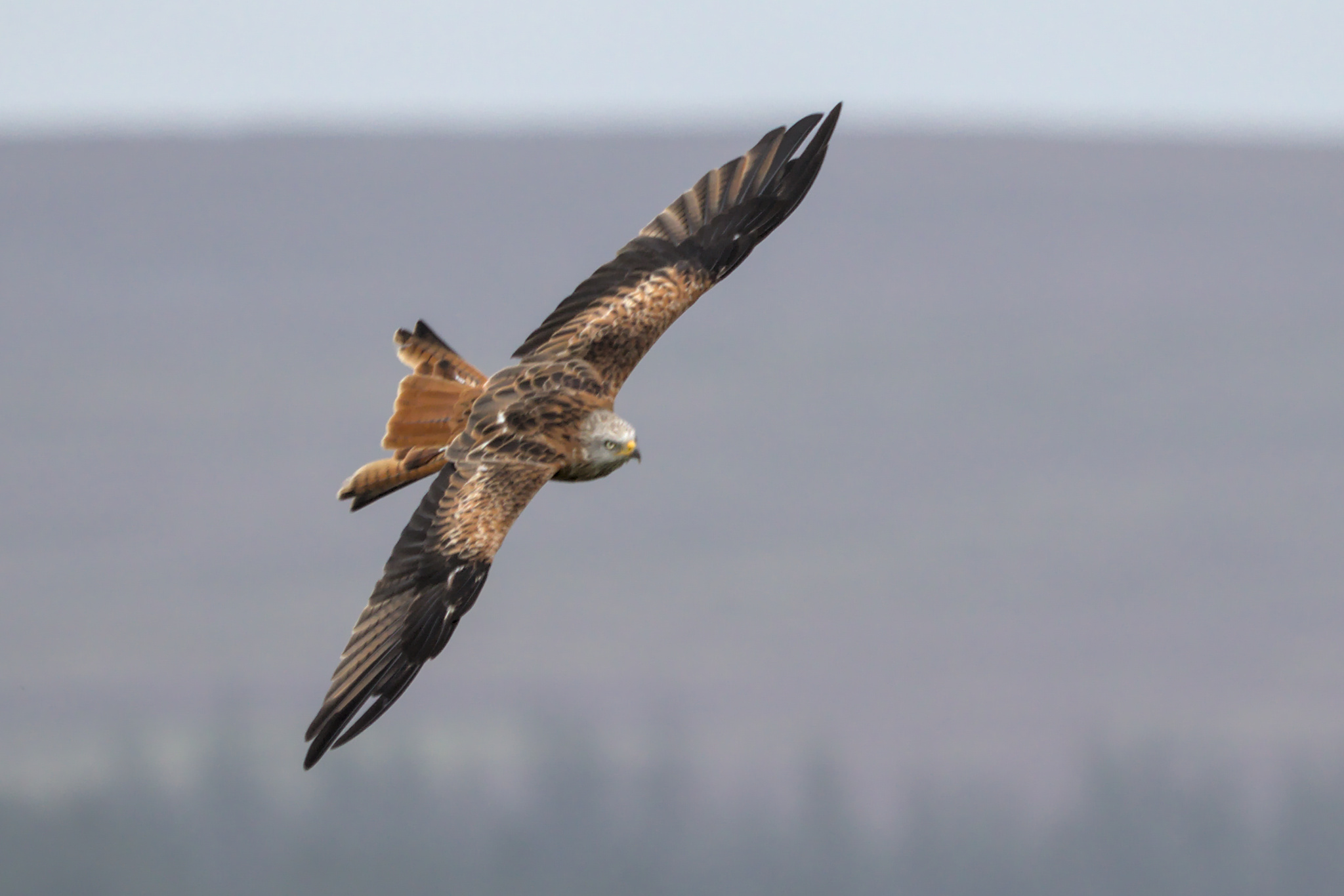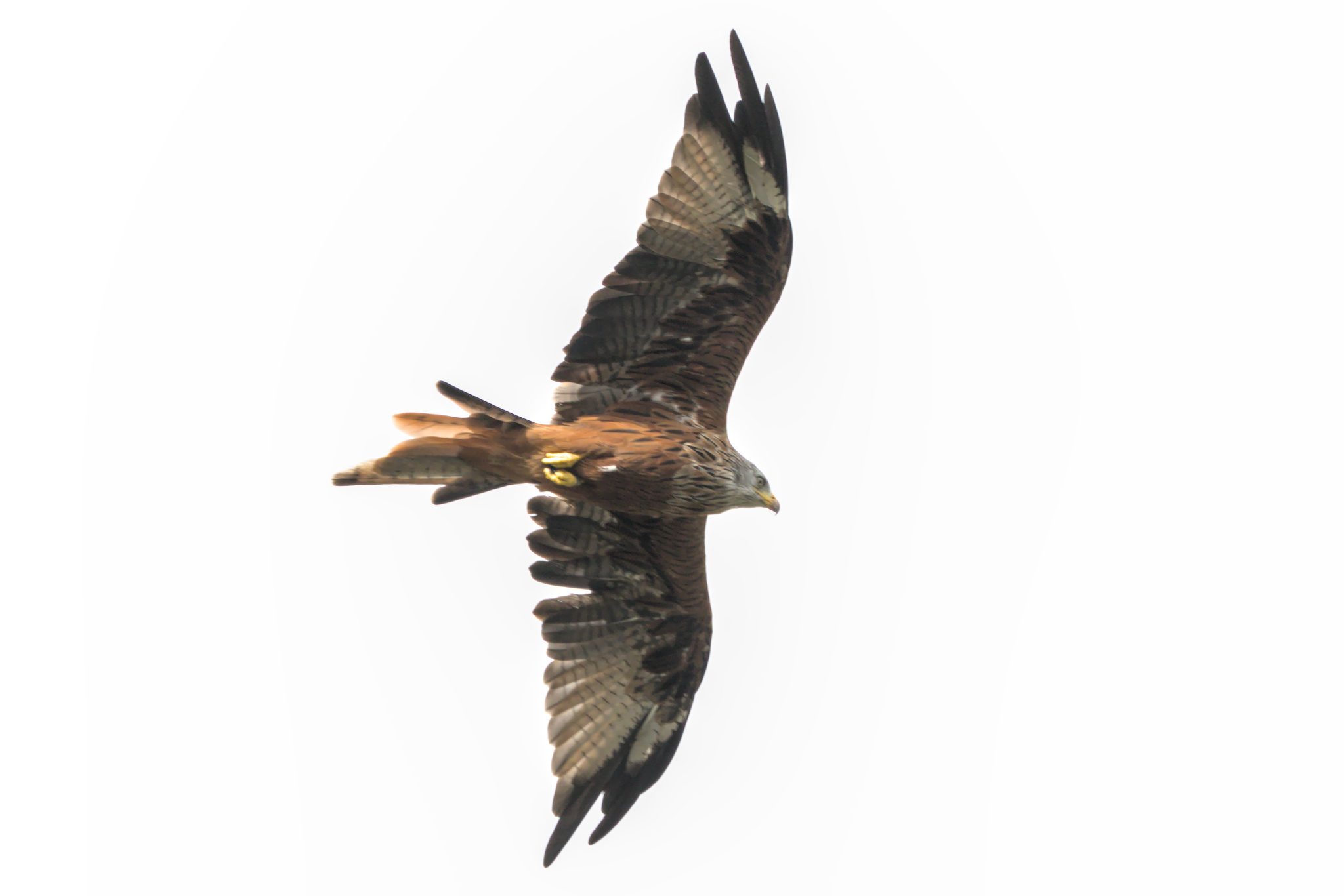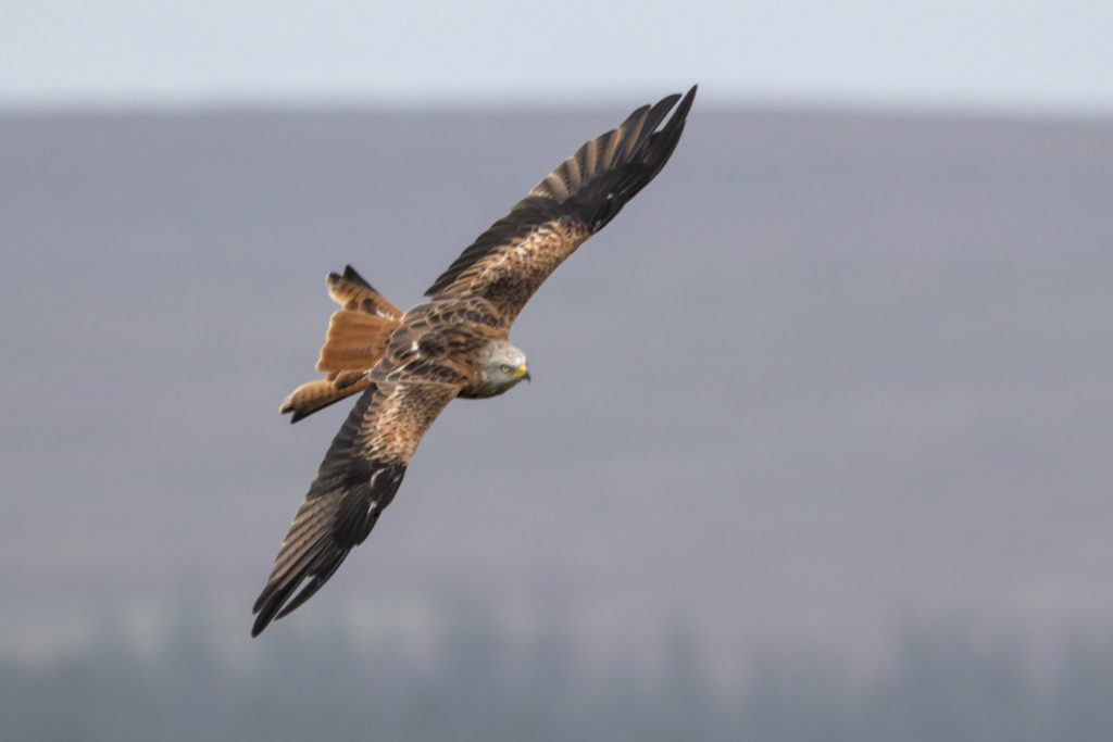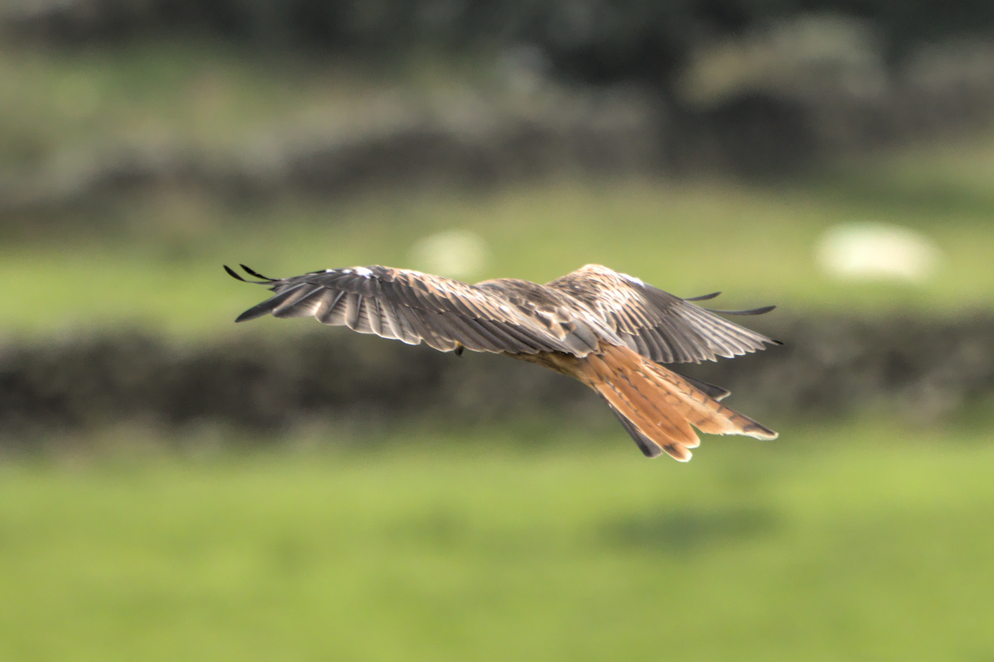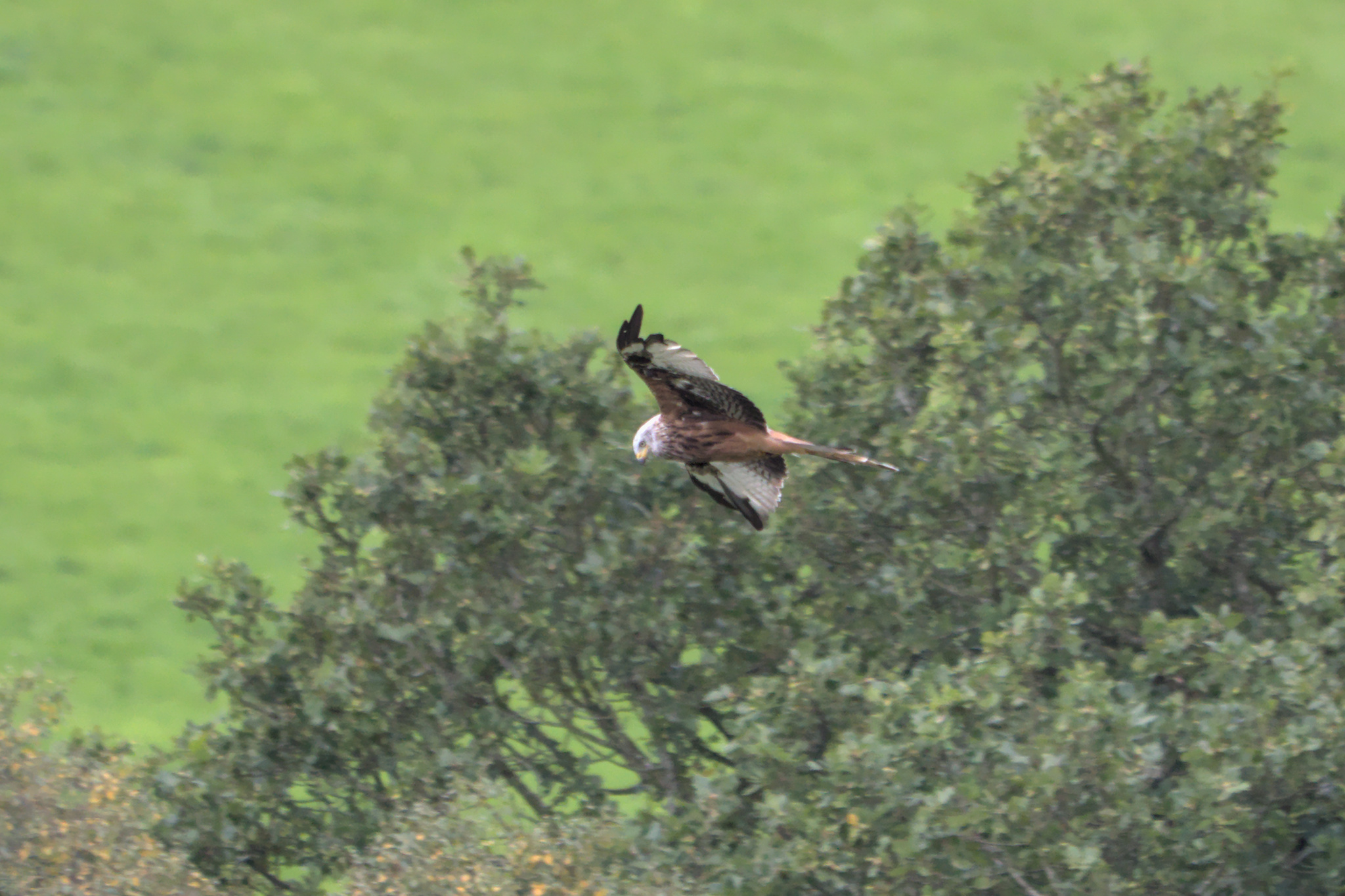 Red Kite circling above a field being cut. Brame Lane, B6451