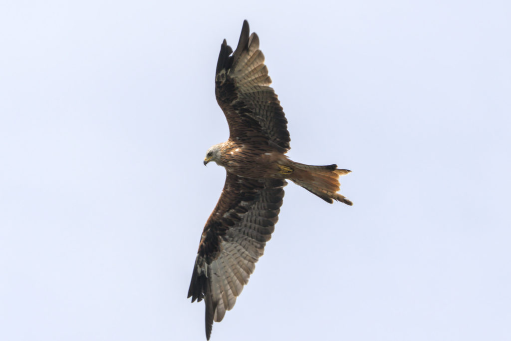 A few minutes later I spotted some Red Kites over a field. This time there was a place to stop the car safely. I watched them and realised that they seemed to be staying in the same area so I got my camera. A tractor was working in the fields cutting and turning the grass for hay. I reckon that there were 5 or 6 Red Kites. Buzzard also spent a while hovering and calling loudly. The Pheasant walked along in the grass at the edge of the road behind my car happily ignoring me. Perhaps it was too busy watching the birds in the sky?