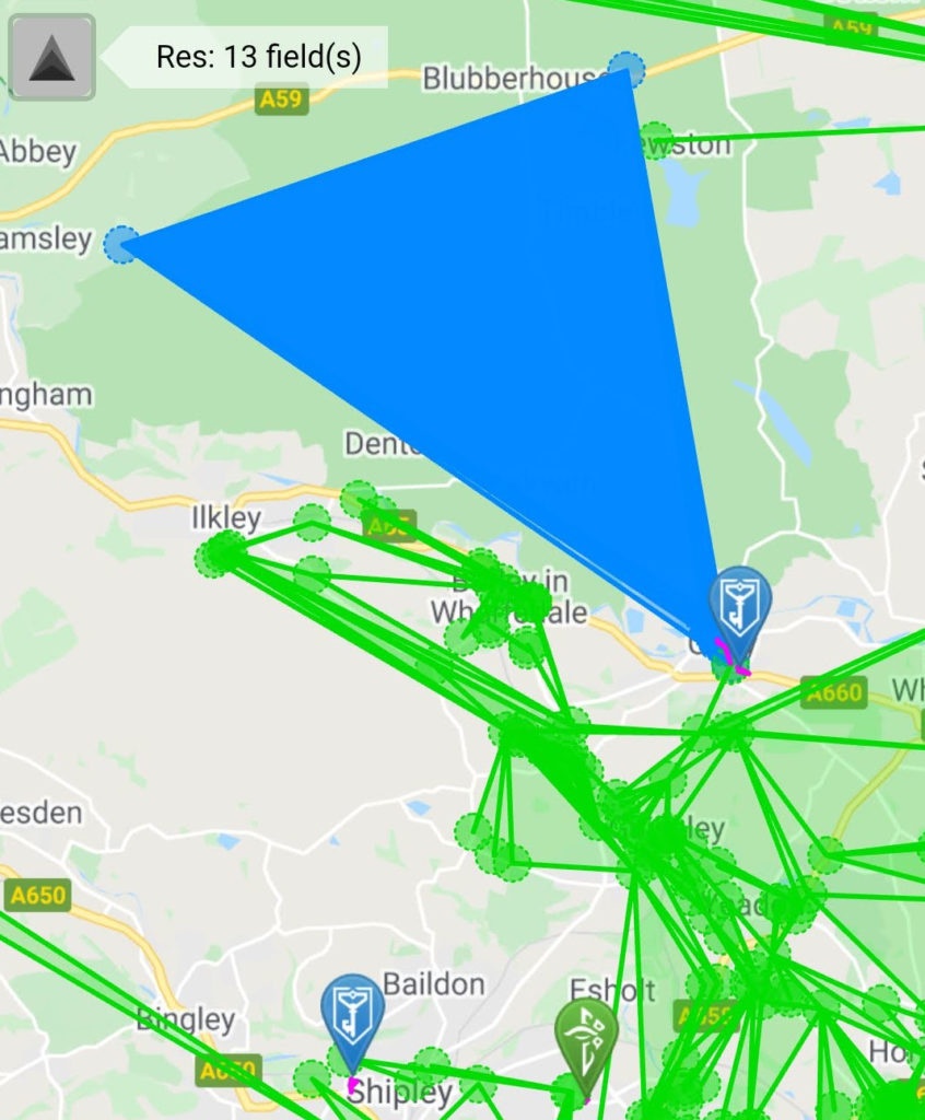 On Saturday I had another look at the Ingress map and set off for Fewston Cemetery. It was strange to be there during the day. The last time I had been there it was dark and late and I was quizzed by two big armed policemen. Fortunately, at the time, I had finished what I wanted to do so I was happy to “move on”. I then went back gown to Otley and made some triangles.