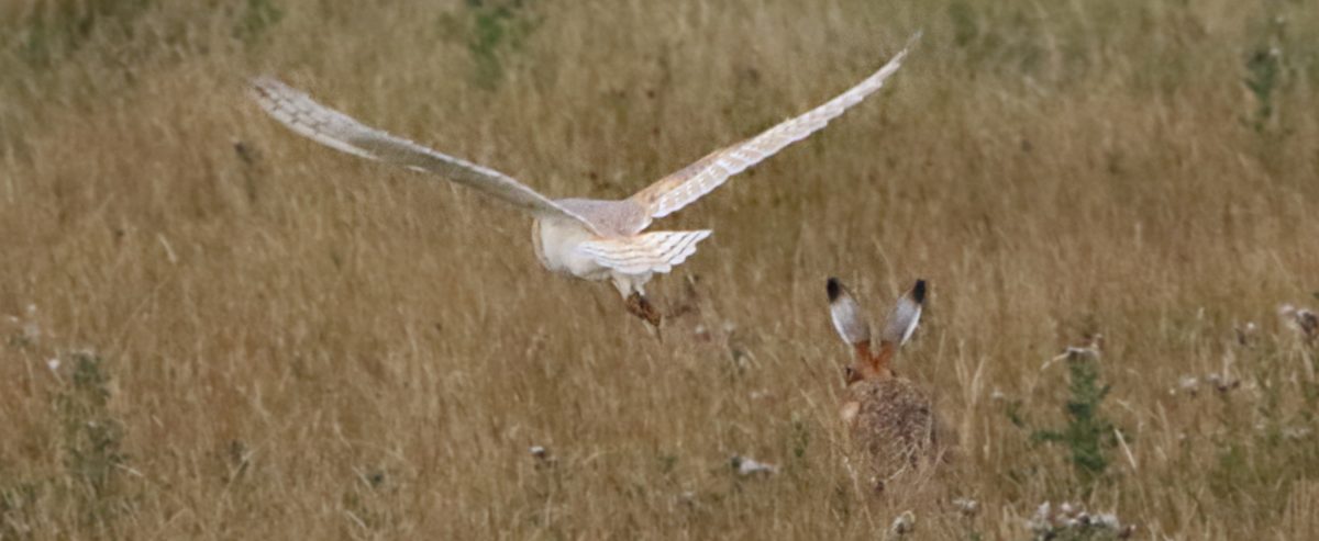During one of its hunting passes it veered off line slightly as though it had heard something and it disturbed two Hares. This photo shows the Owl flying almost over the top of one of the Hares that is starting to run off. This is a little surprising because I thought Hares tended to sink down to the ground when threatened. I this case it seemed to think that running was the best option.