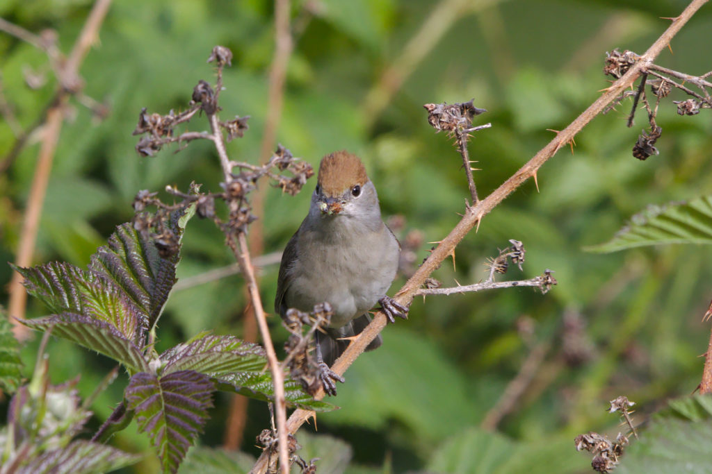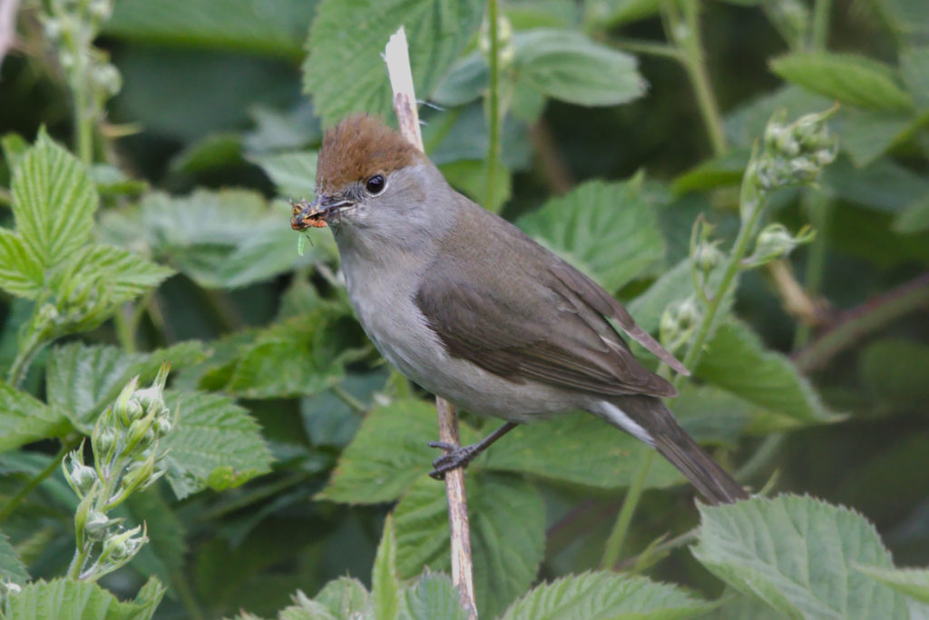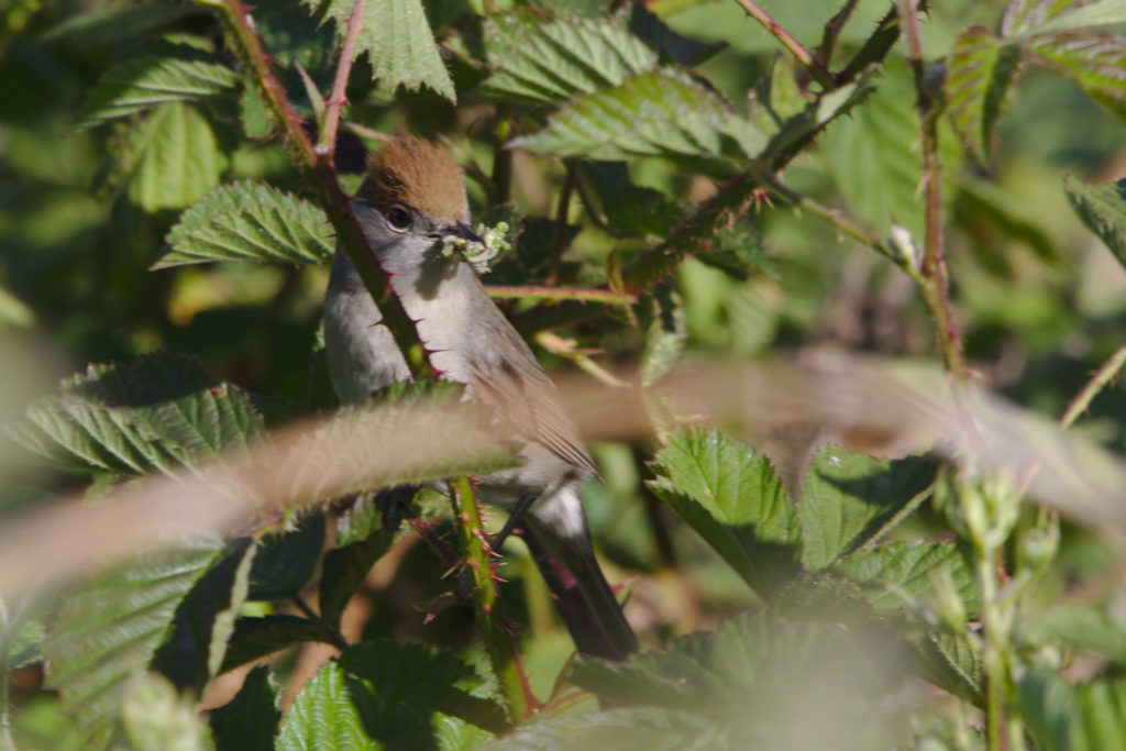 A pair of Blackcaps were flying into the Brambles to feed their young. The male has the black top to its head and the female brown.
