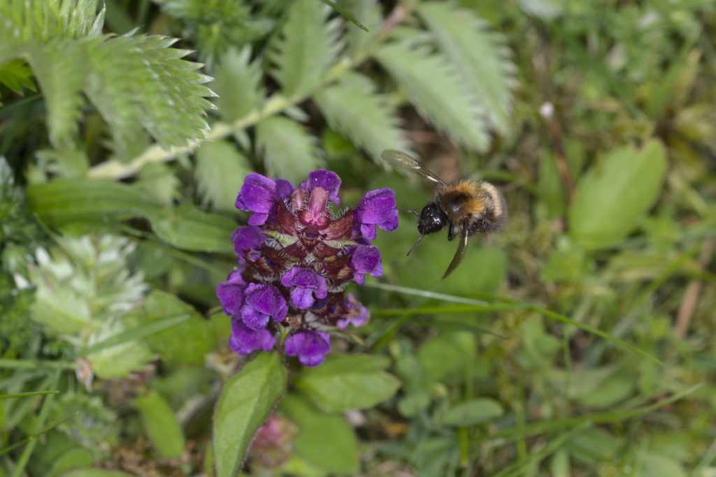 Bumble Bee approaching Selfheal (Prunella vulgaris)