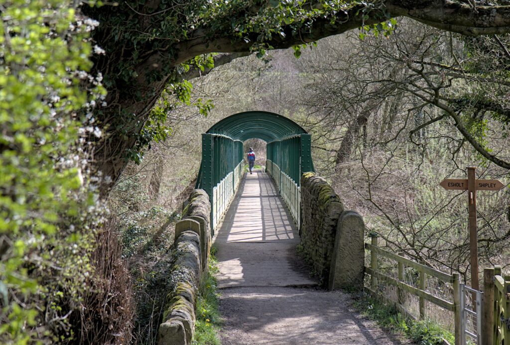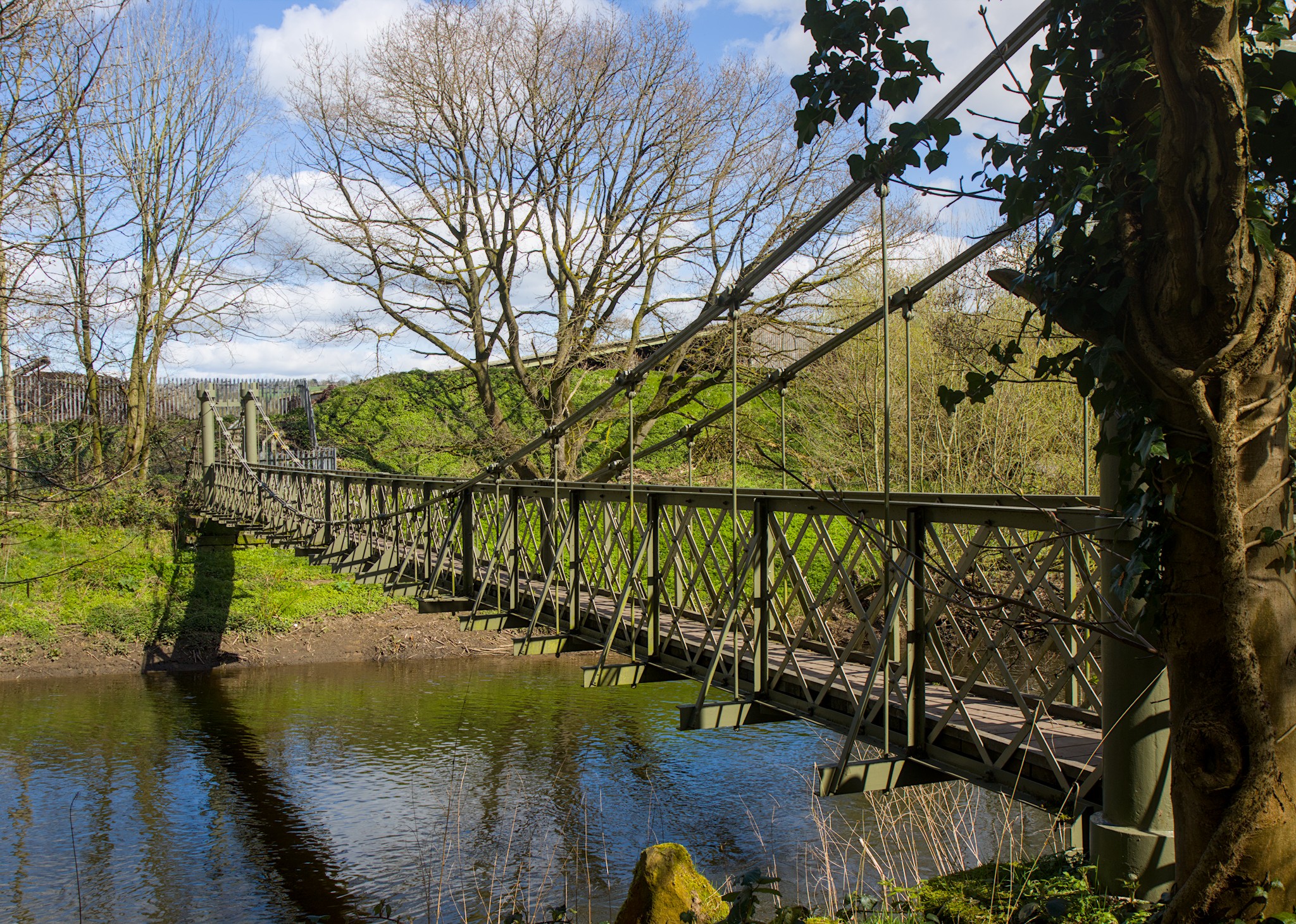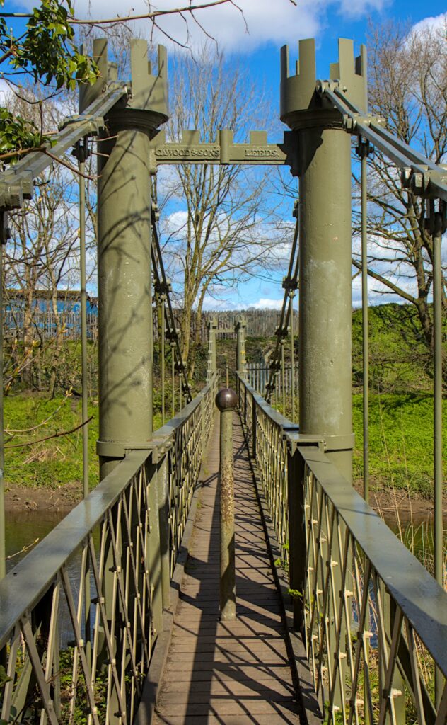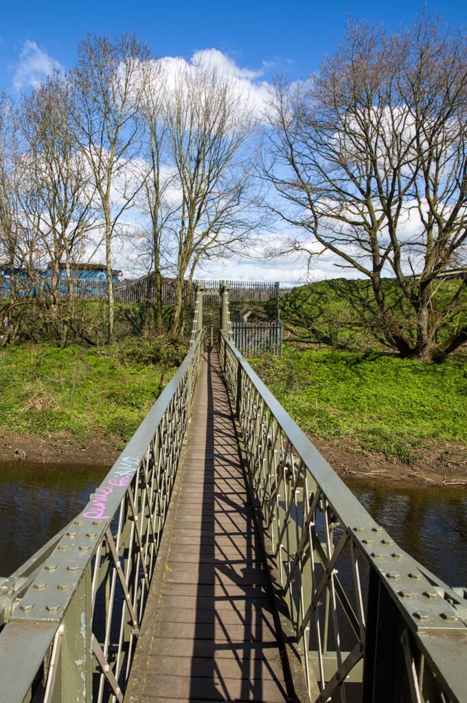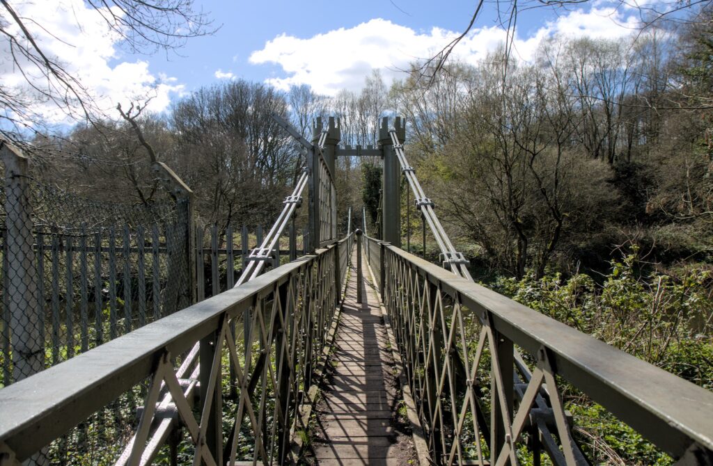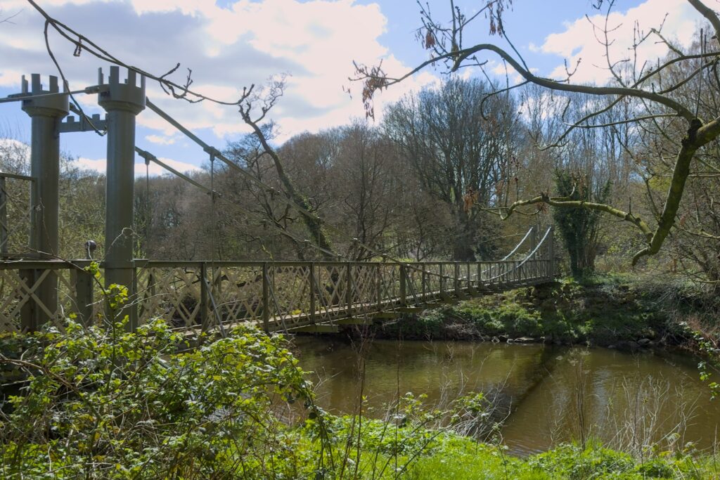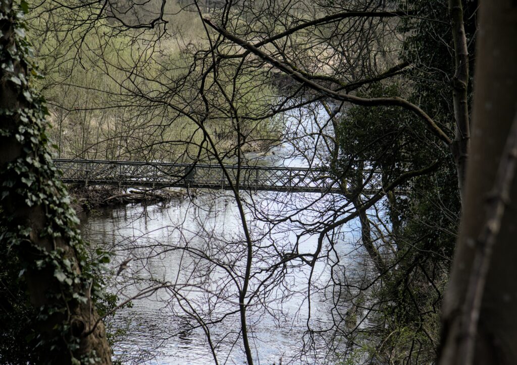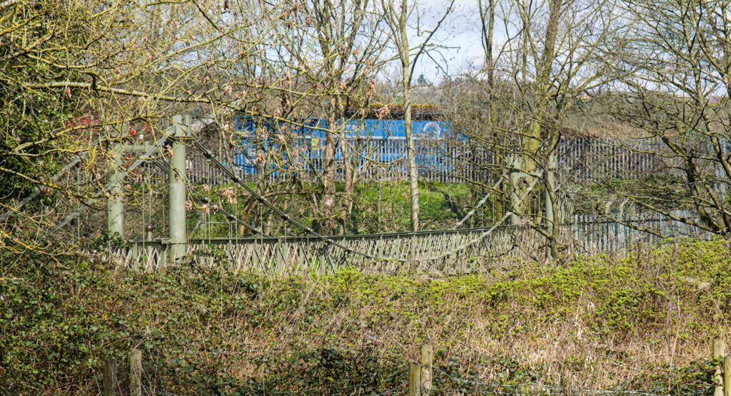 The other candidate for the camera club challenge was the Esholt Suspension bridge. I took a slight detour off the canal towpath to get my first glimpse of the bridge through the trees. There is then a path down to it that at one time had concrete posts and rails and substantial steps leading to it. Can I suggest that you don’t go down to it in Winter wearing thick jumpers and coats. If you do then it could be a struggle to squeeze past the posts that are at each end of the bridge. I had to lift cameras and binoculars up to get just me through.