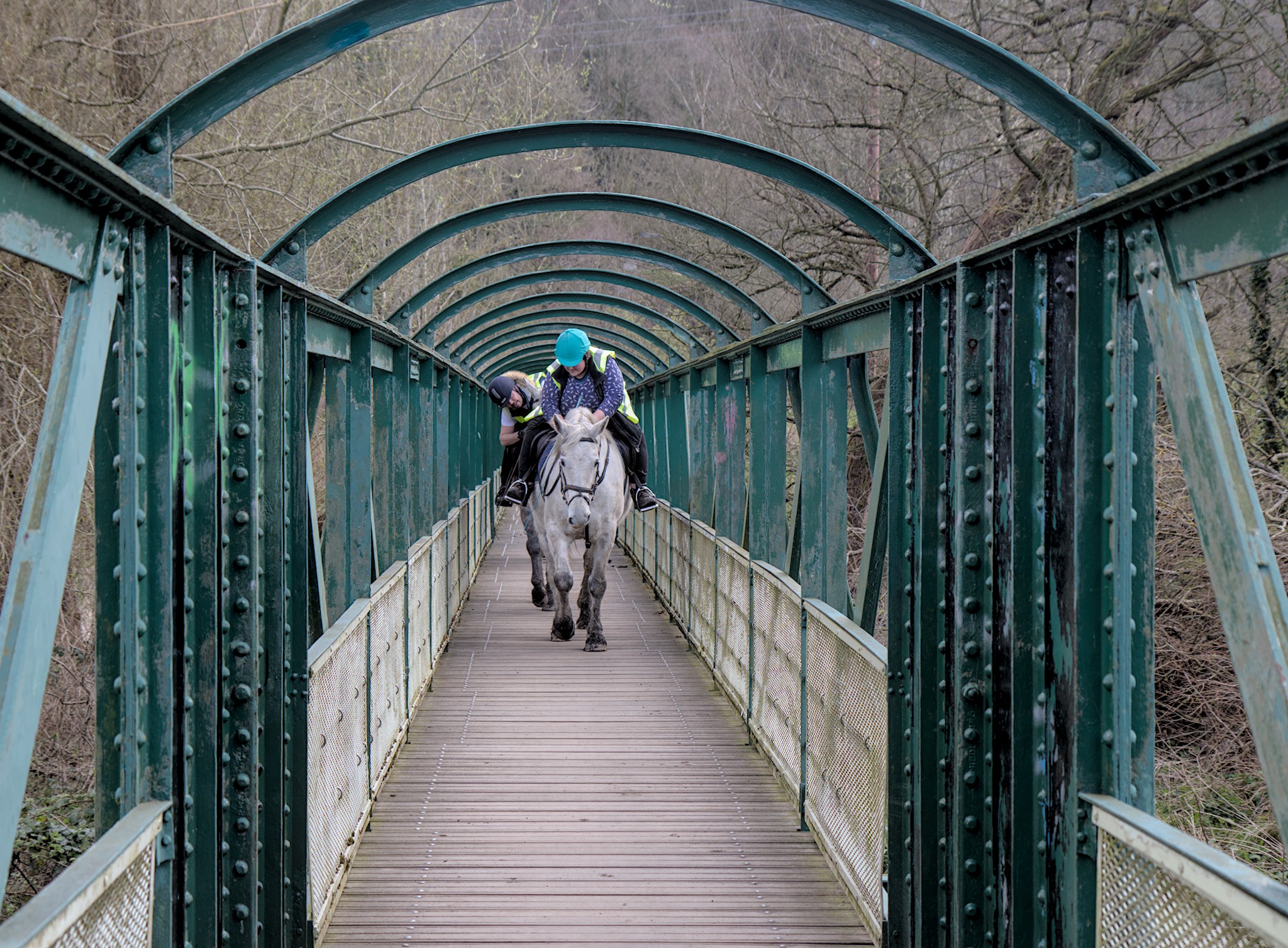 I will be back to the bridge many times and I might try for some more with horses crossing it. This time I was more than half way across the bridge when they came onto it. I would like to get some photos with a greater length of the bridge showing. I’m not sure if they will work as a photo but if I don’t give it a try I won’t know. I quite like this one with the horse looking straight forward and the riders bent over to avoid cracking their heads on the top rails of the bridge. The website can crop the shape of the images so to see it at its best please click on it to load it in its gallery carousel.
