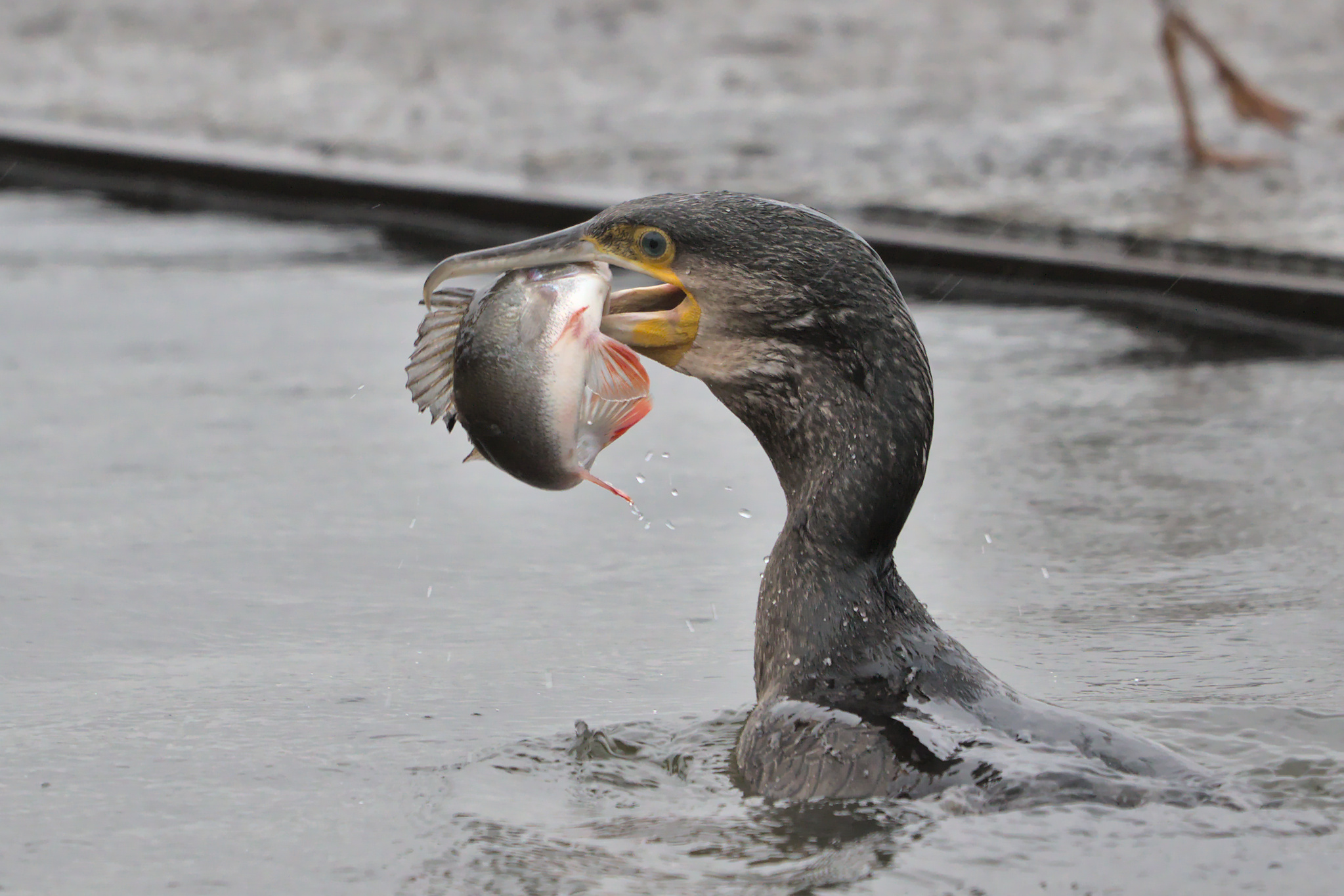 I kept an eye on the Cormorant as I was walking along the path back towards my car, after all I was getting soaked, and was pleased to see it still diving, and then it came up with a fish. If you compare the size of the Cormorant’s head when it is looking face on you wonder how it can get such a fish down. The bottom mandible can widen and the whole back of the beak open up. I have seen the same thing in Grey Herons. When they look at you head on they only look the width of a pencil but can widen to get big fish down their throats.