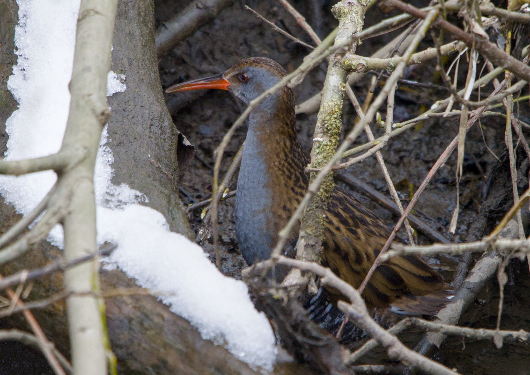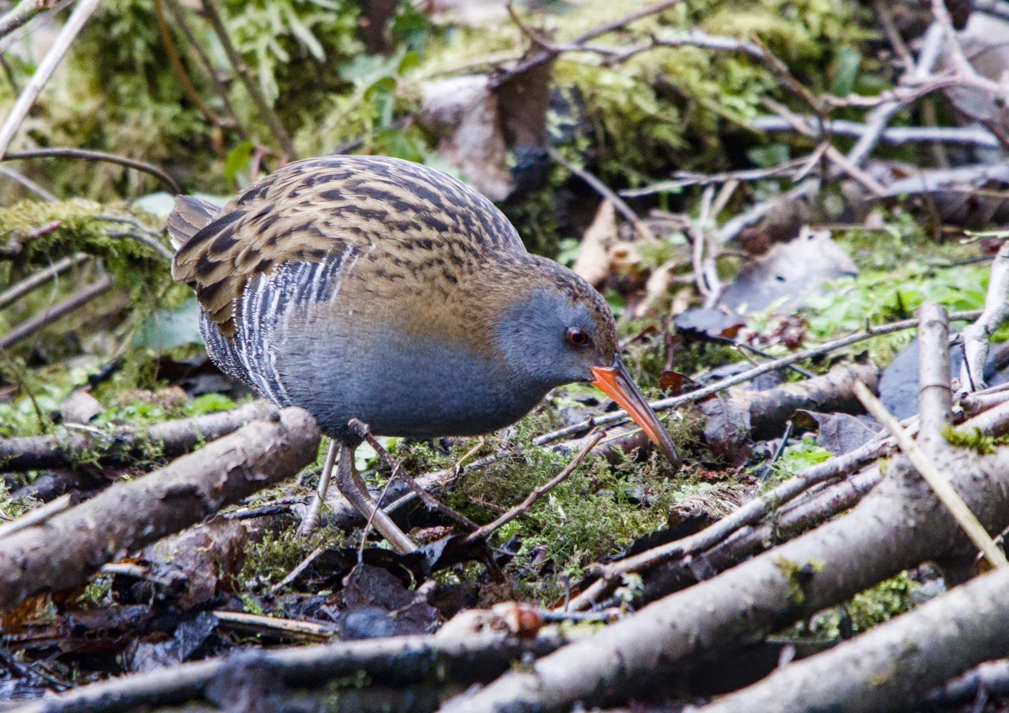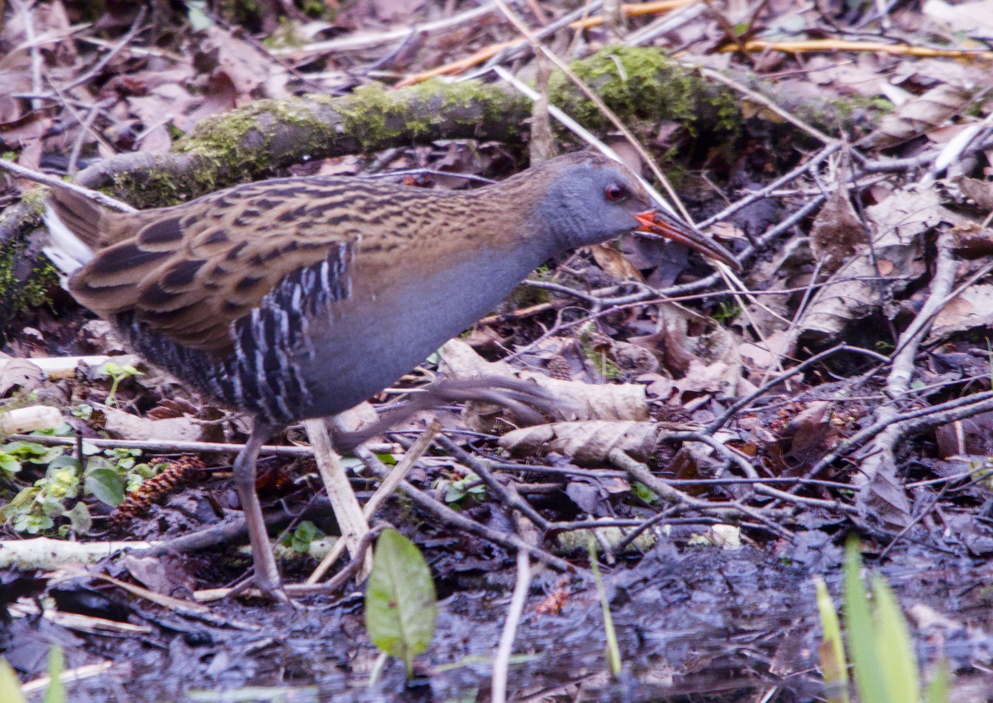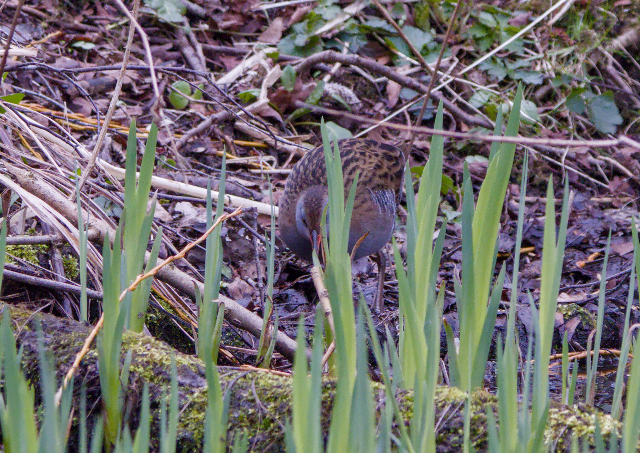 A couple of minutes later a Water Rail showed itself and walked amongst the branches, leaves and rubbish. I guess old sheets, shirts and other fabrics fold over and collect mud and stuff in the folds. Insects and worms will then inhabit the folds. We could see the Water Rail picking and turning the rubbish and eating what it found. It was turning things out of the way in the same way Blackbirds do with leaves.