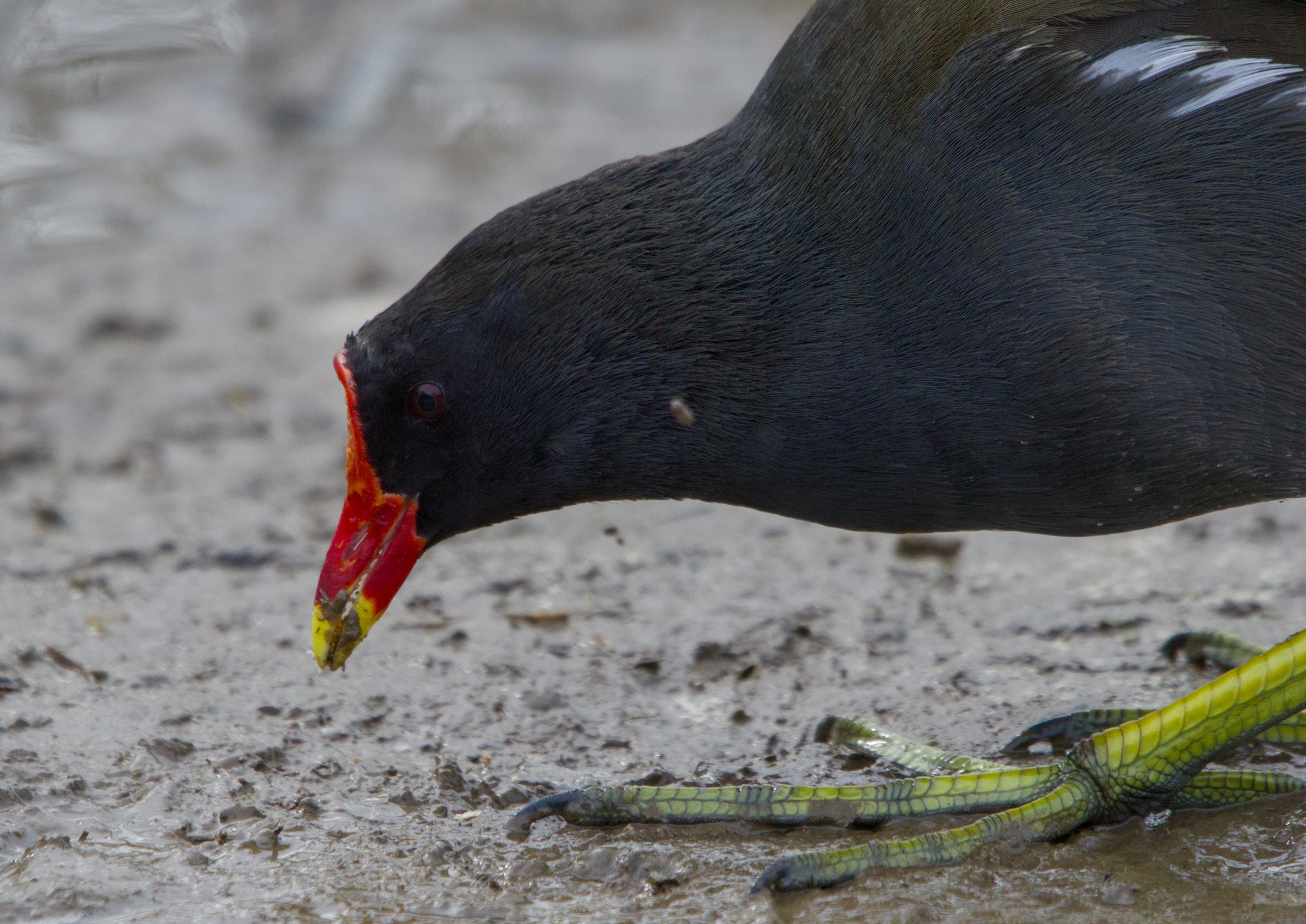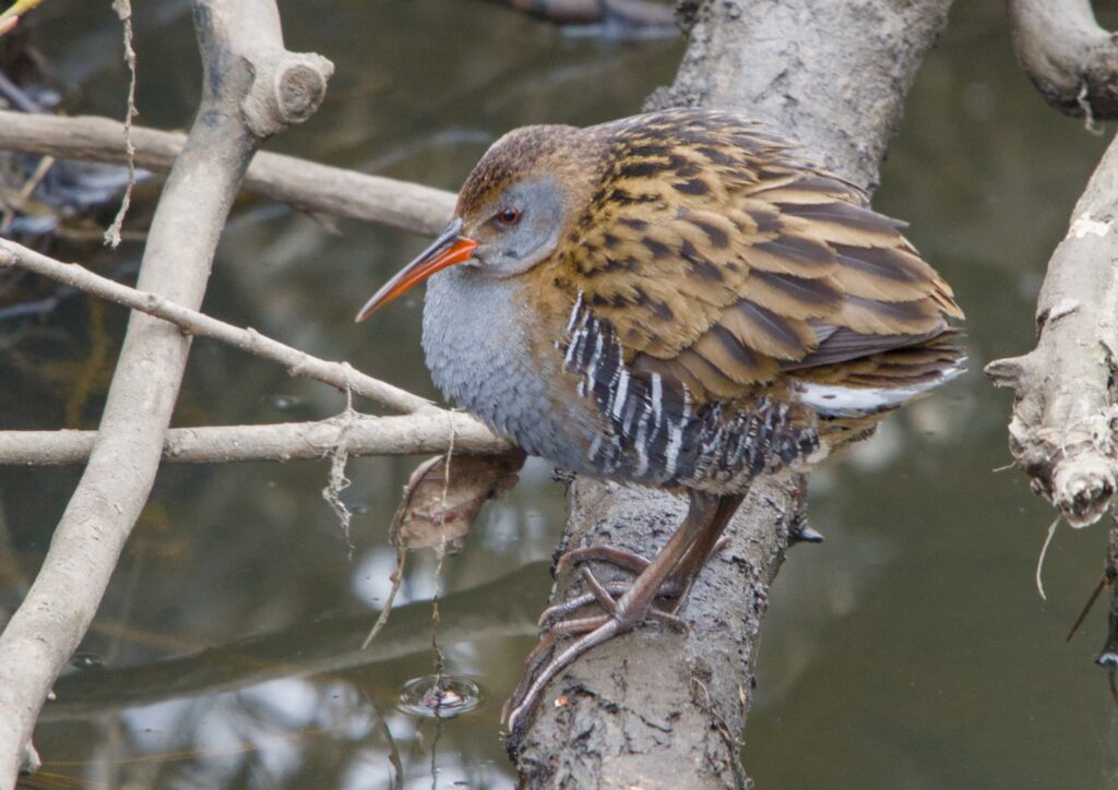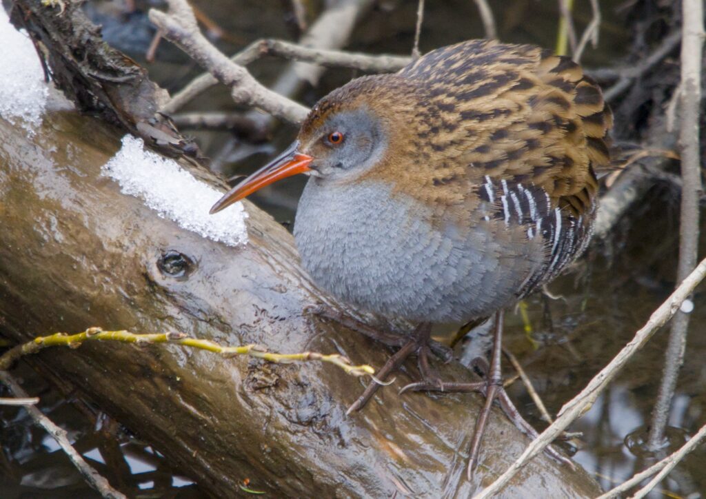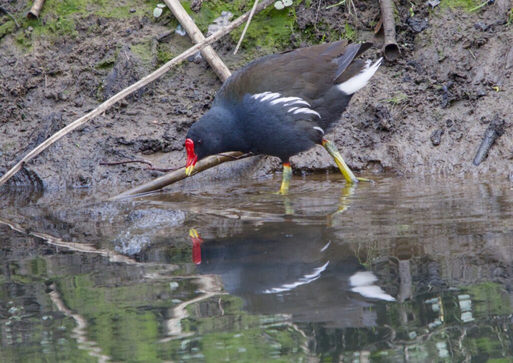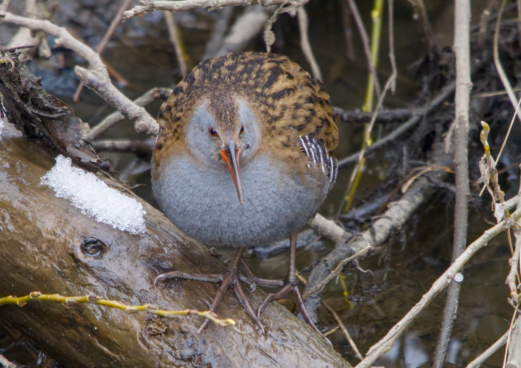 A couple of minutes later a Water Rail showed itself and walked amongst the branches, leaves and rubbish. I guess old sheets, shirts and other fabrics fold over and collect mud and stuff in the folds. Insects and worms will then inhabit the folds. We could see the Water Rail picking and turning the rubbish and eating what it found. It was turning things out of the way in the same way Blackbirds do with leaves.