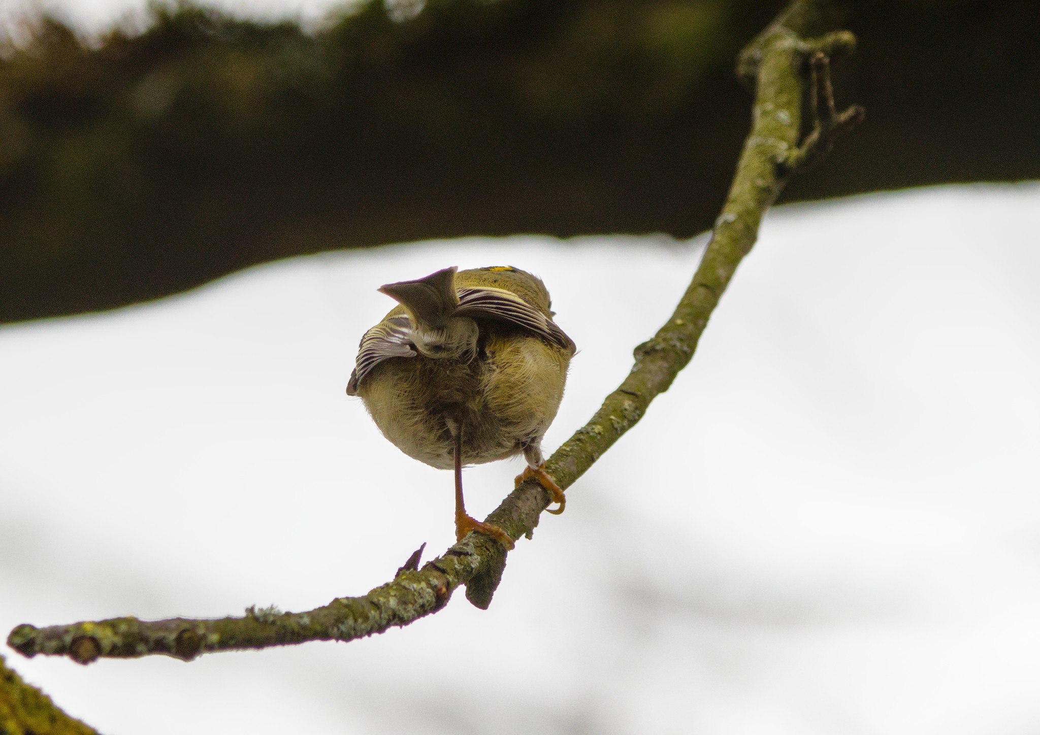When we got to the far side of the bridge we saw movement but it quickly disappeared. A Goldcrest flitted about the trees in front of us and managed to get it in the frame and focused once. You can at least see the stripe on its head.