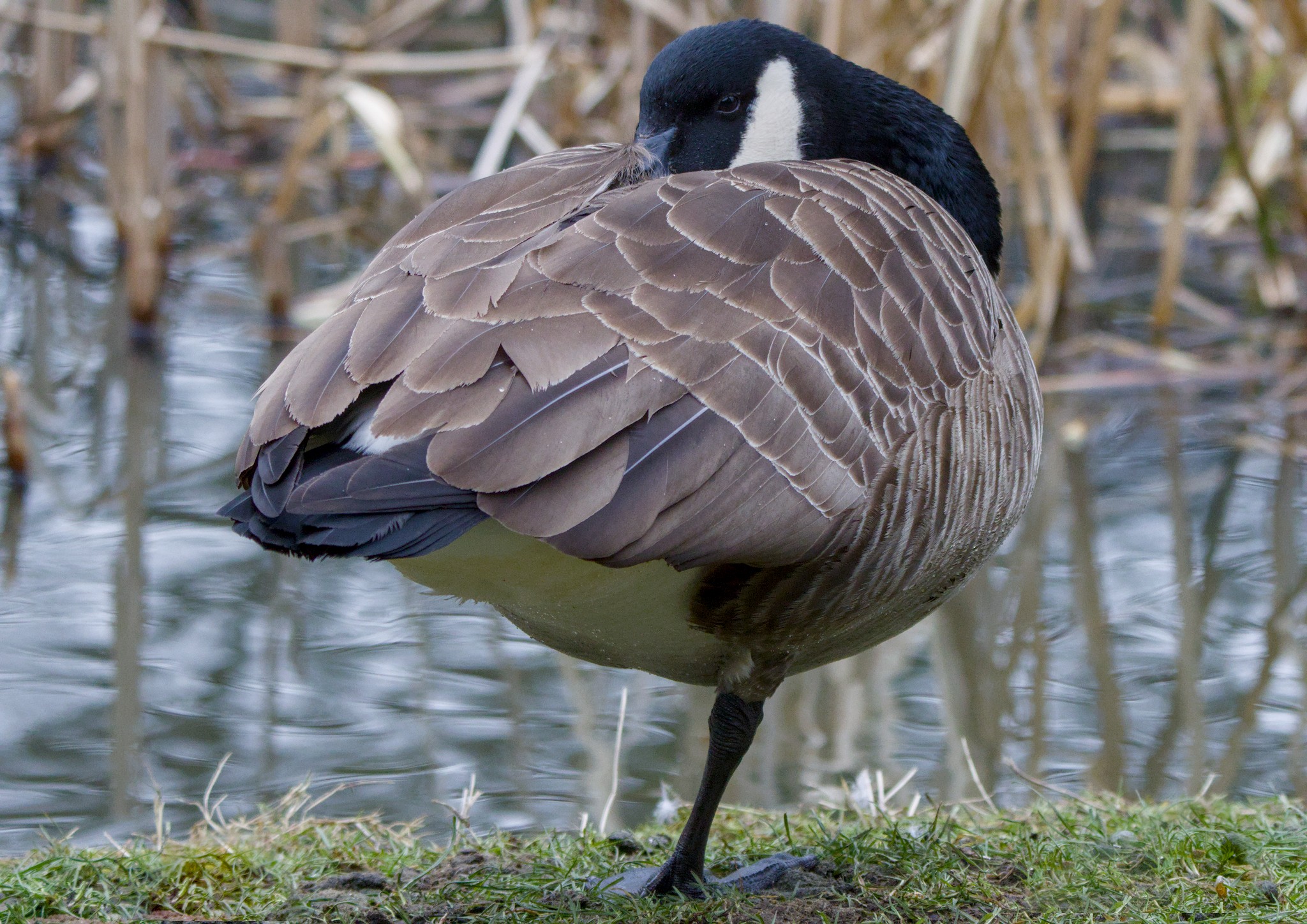 I then walked back up river to the reserve, and there was a Cormorant. As I watched it dived, dove, went under water a few times and travelled quite a distance before surfacing. At the pond several Canada Geese were looking as though they were going to be staying there for the night. From the path near the feeding station I spotted movement that I first thought was a Moorhen, there are several on the pond and they are probably going to be nesting there. Dogs on leads please. With my binoculars I could see that it was a Water Rail. I watched it walk along the edge of the pond and took a couple of photos. It then went behind the reeds. Assuming it would continue along the edge I walked to the wooden footbridge and waited. A few minutes later the Water Rail came out from behind the reeds and I got a photo before I headed for home.