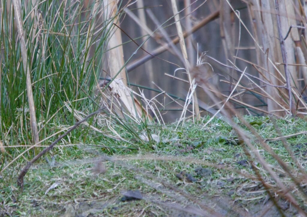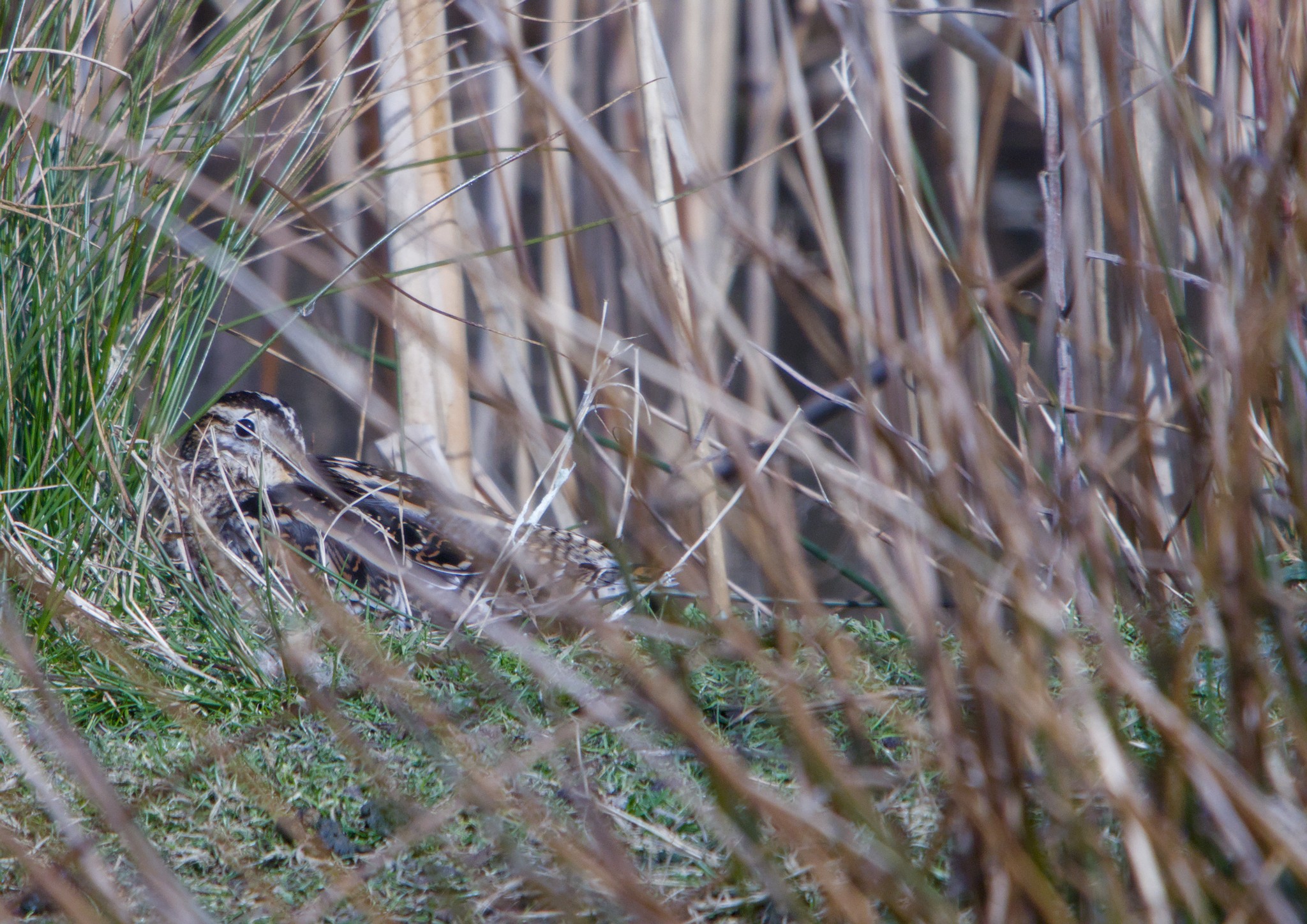 There were the usual culprits, Moorhen, Mandarin Ducks, Mallard, Crows, Jackdaw and Black Headed Gulls. The Robin was very friendly, it came right up to me feeding as it was going. On my first walk around the pond I spotted a Water Rail on the edge disappear into the reeds and then a few seconds later another do the same. I did spot a couple of birds fly in quickly showing a flash of white and also heard faint chip-er noises. Snipe? Now I think back I reckon the birds flying in looked more like Redshank than Snipe. On my second walk round the pond I spotted tell tale colouring on one of the little “islands”. It didn’t move and was difficult to get the camera focused on but looking at it now that is definitely an open eye of a Snipe behind the grass. As I continued walking round the Snipe was hidden by the grass on the left of the photo. I did hope to get a different angle on it but the grass curved round and protected it. On the third walk round it had moved on.