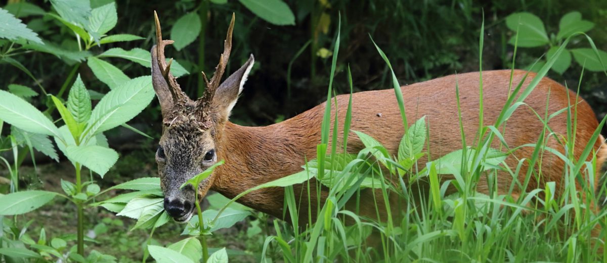 It then picked its way through sheets of plywood, sheet metal, drain pipes, washing machine drums and then climbed the bank and disappeared. In amongst the vegetation is where you might expect to see Roe Deer – not stepping through all the rubbish left around by us.