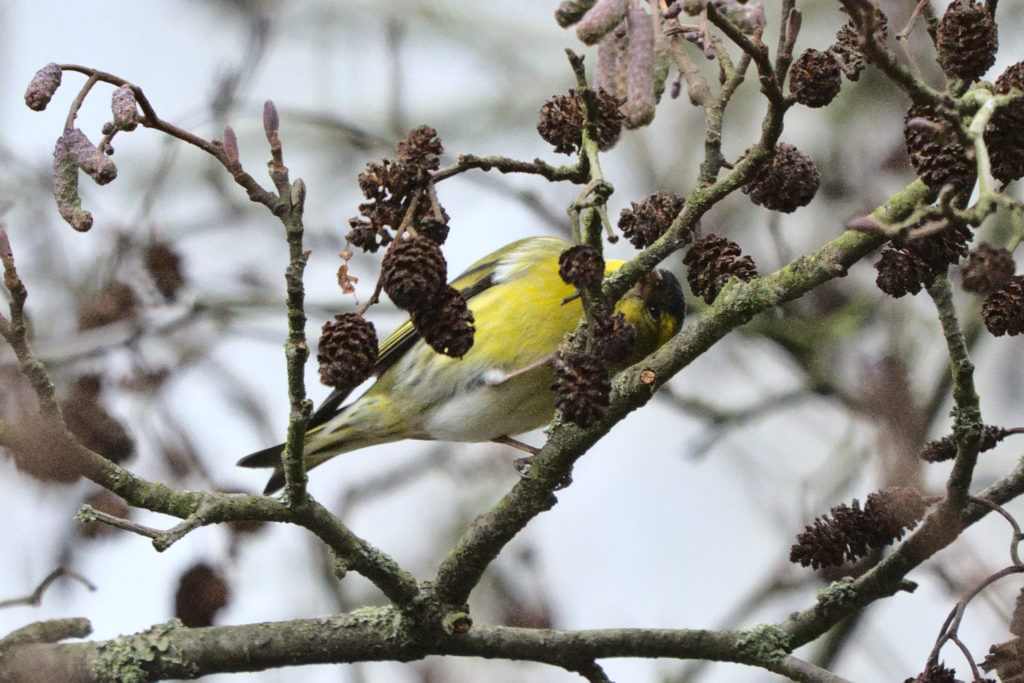 With binoculars the birds were identified as Siskins. They tend to be Winter visitors to the area, either from further North or Europe. With the camera, and dialling in some over-exposure to stop them appearing as silhouettes, they could be seen reasonably well. They seemed to quite like the seeds in the Alder between the pond and the feeding station.