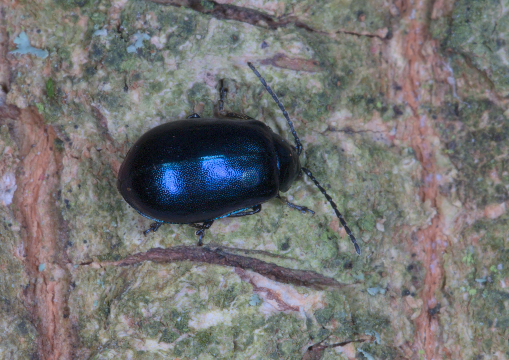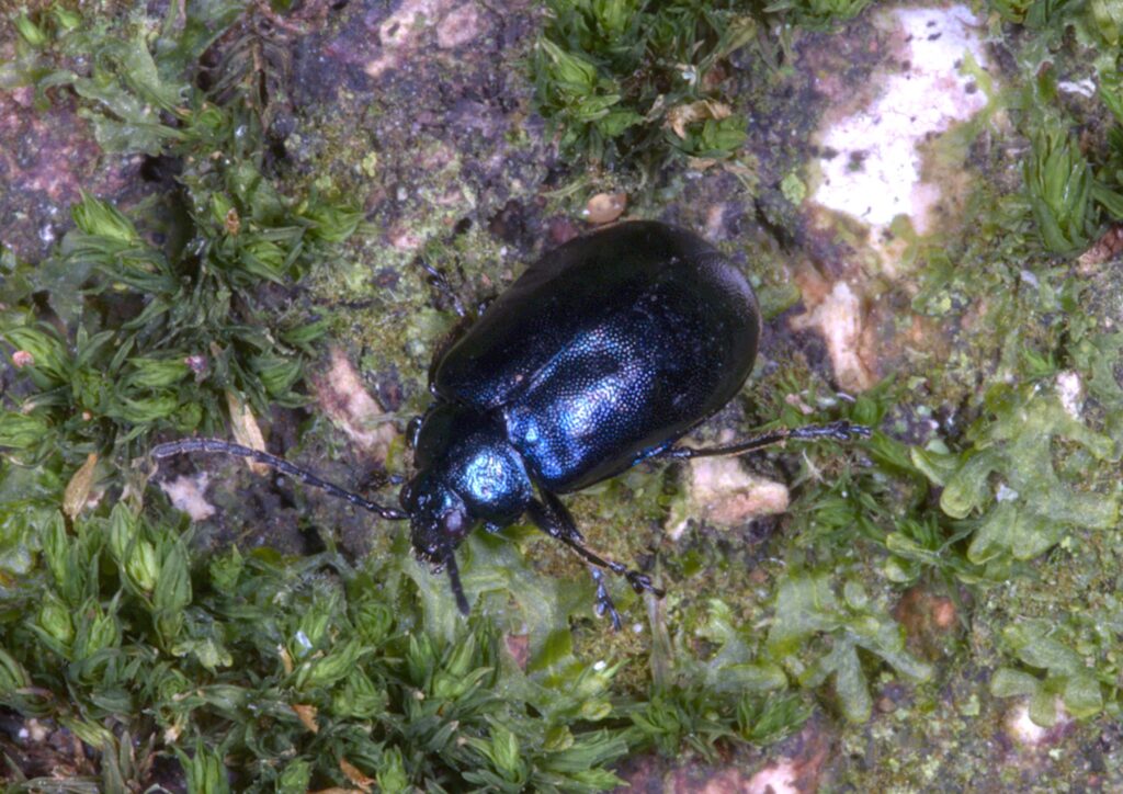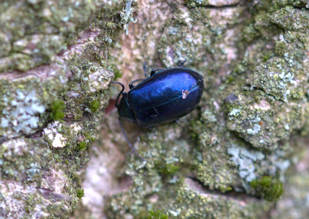 On one of the trees near the gate I spotted a few blue beetles – Alder Leaf Beetle – Agelastica alni. One of them looked as though it had a small round hole in its wing cases, curious. On looking closer I could see that a lot of the crevices on the tree were packed with dozens of the beetles. I have yet to get an ID for the tree, it didn’t look right for an Alder, there were no catkins.