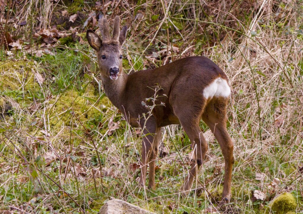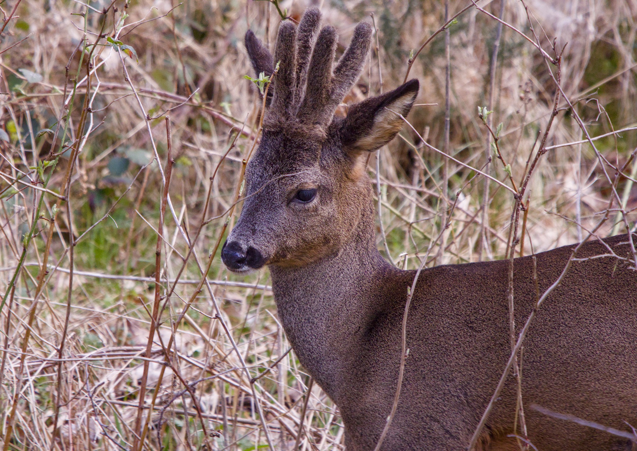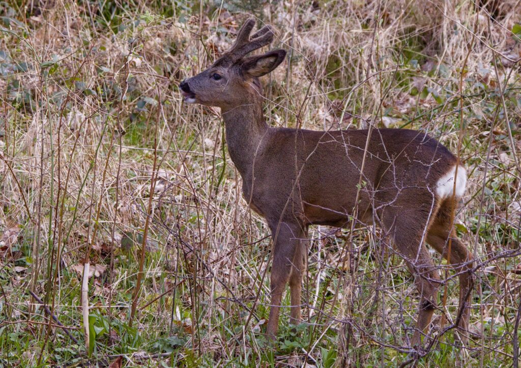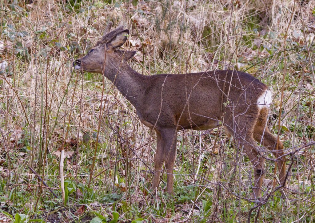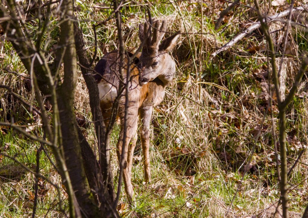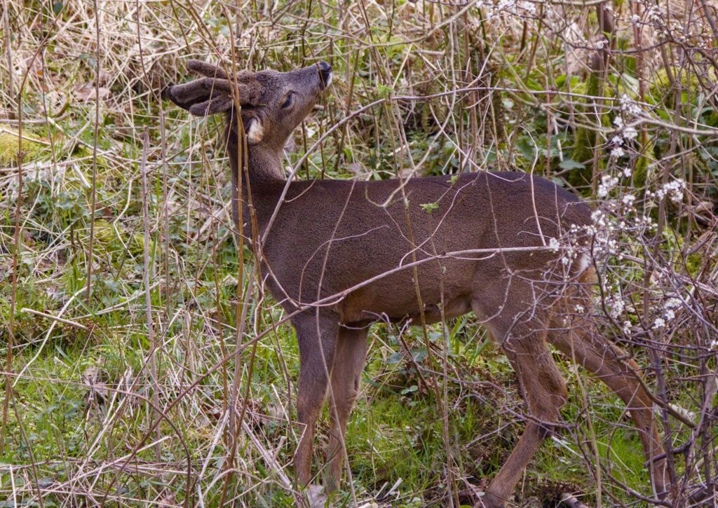 I followed a Roe Deer along the river for a while, watching it feed on new leaves from various plants on the other side of the river. It looked around a few times but seemed happy to saunter along until it decided to climb the bank and go out of sight.