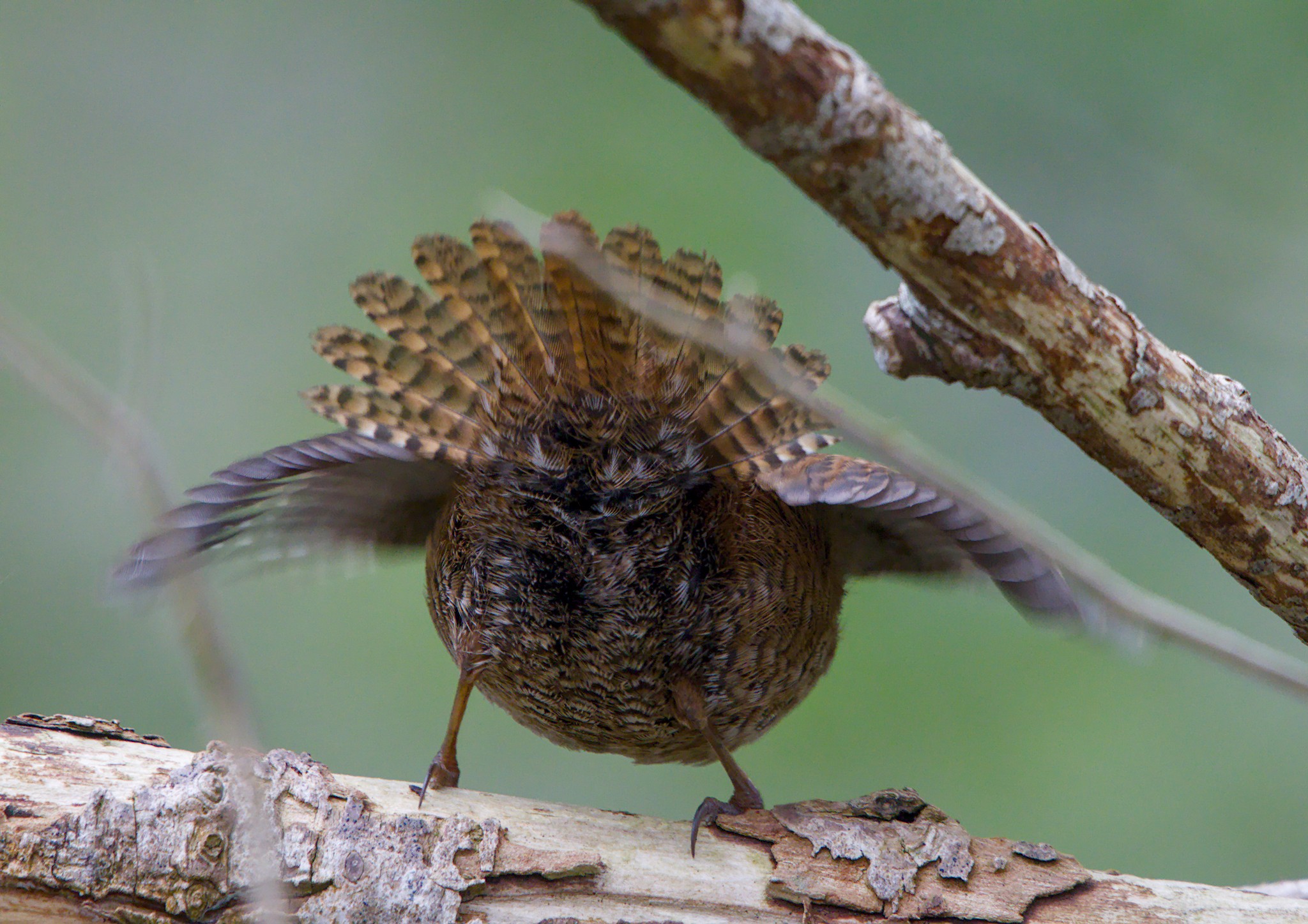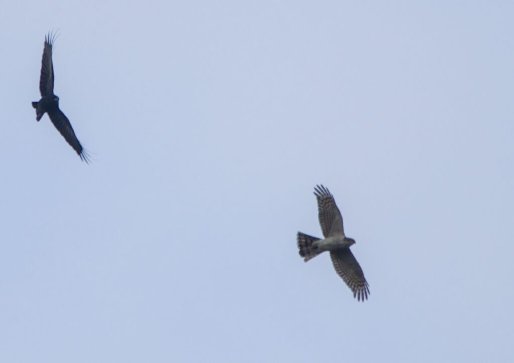 I have never seen a Wren spread its tail like that before. It could be something they do as they start to fly or it could be part of its display. Just before setting off it had been singing loudly. I got several good sightings of a Sparrowhawk but the only photo opportunity was one in the distance being harried by a Corvid.