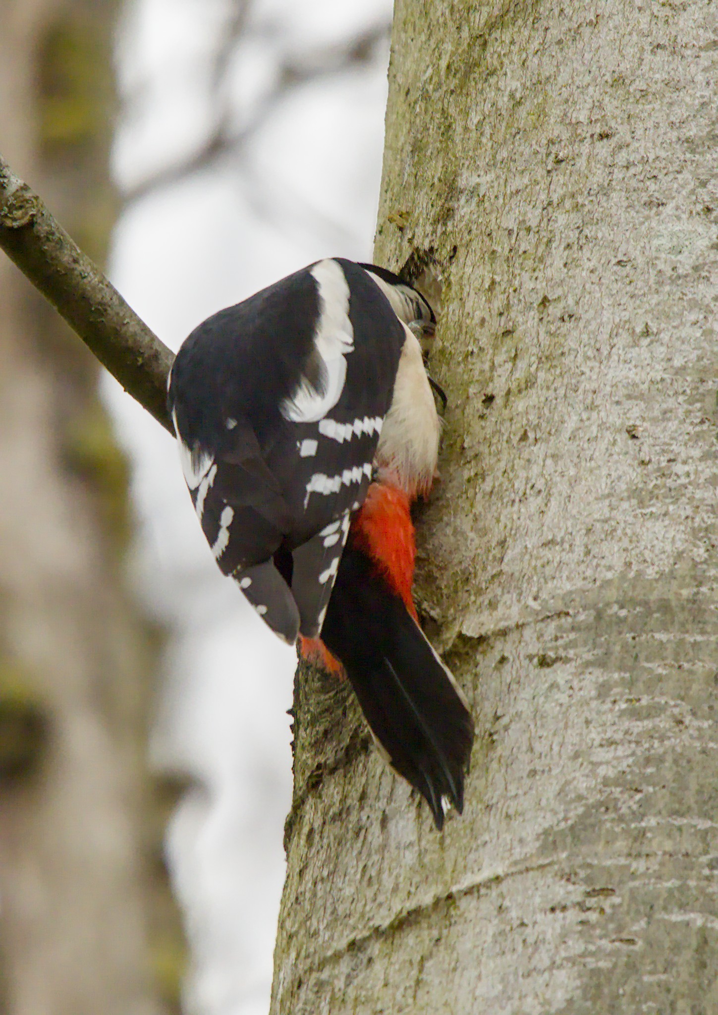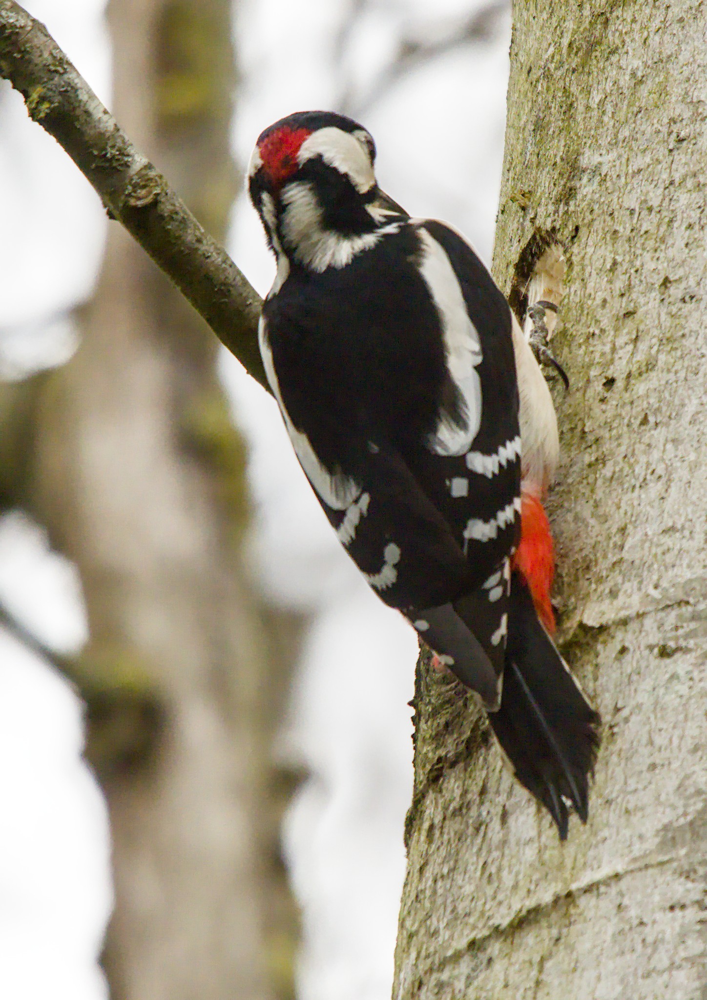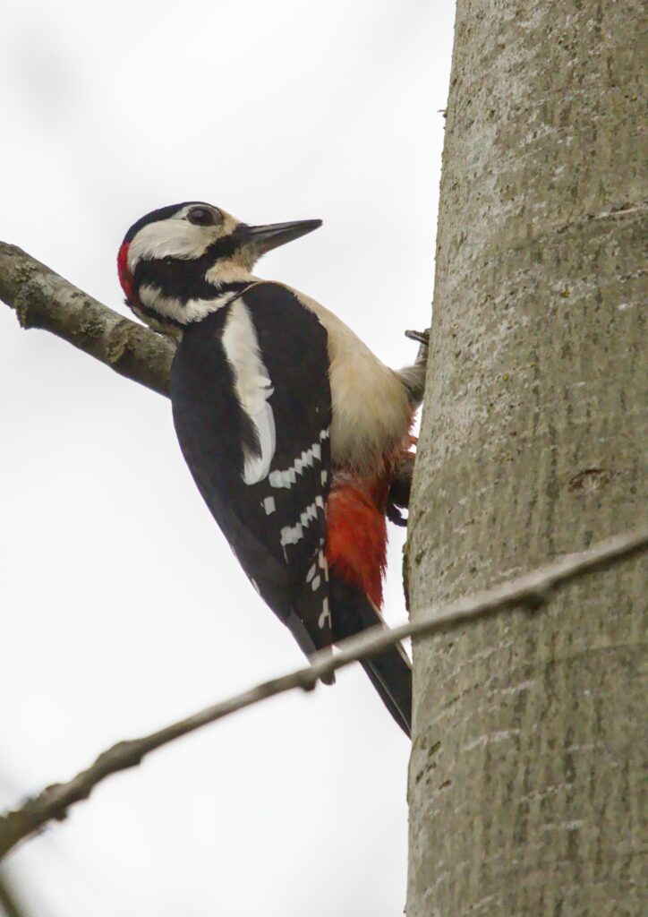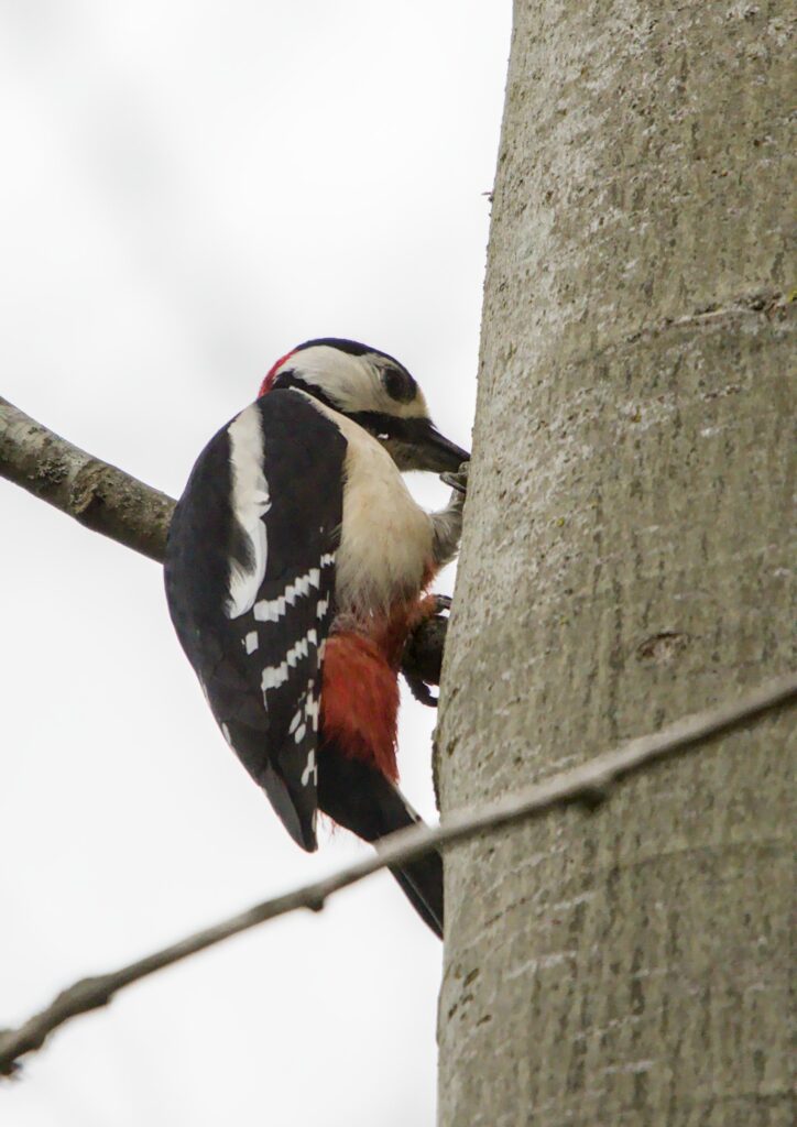 During the walk around I heard a Great Spotted Woodpecker drumming a couple of times and heard a few calls. The female I spotted near the Spider Club feeding station. A bit later I saw a Woodpecker fly to a tree so I carefully manoeuvred until I could see it. I could see that it was pecking but there was no characteristic drumming sound. I then realised that it was a male and it was pecking a nice round hole in the tree for a nest.
