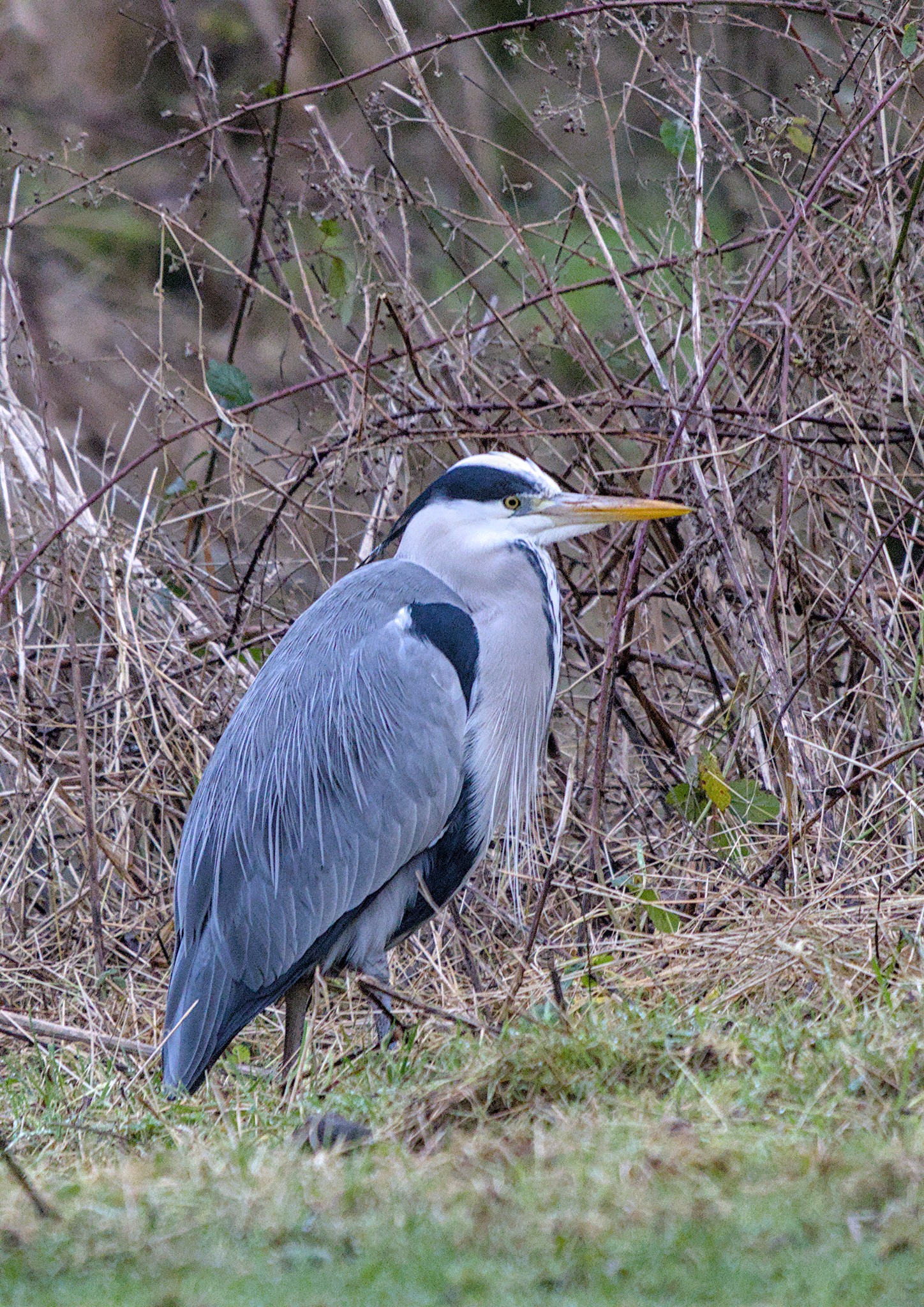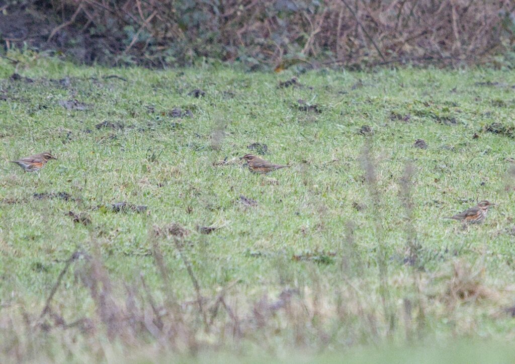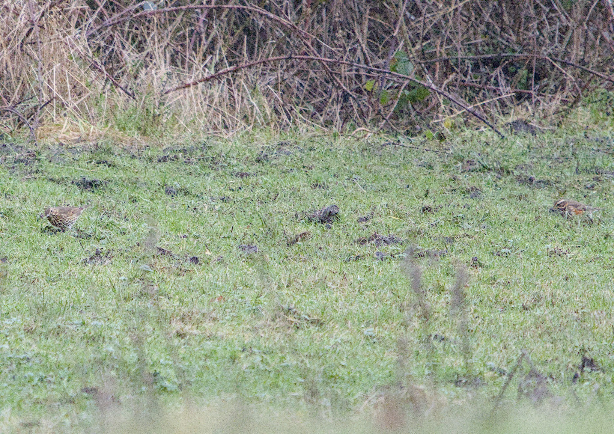 Looking across the river, up towards the canal, I could see birds feeding in the grass and then flitting into the cover of the brambles and trees. I could see that some of them were Blackbirds. After watching the others for a while I decided that they were Redwing and Song Thrush – no Fieldfare. The photos of them are quite heavy crops and even then the birds are small but identifiable.