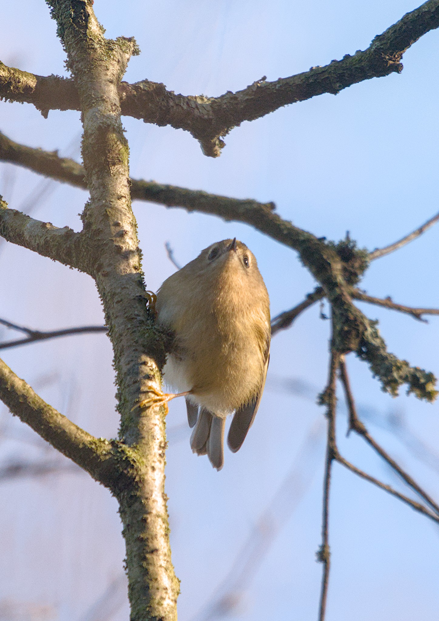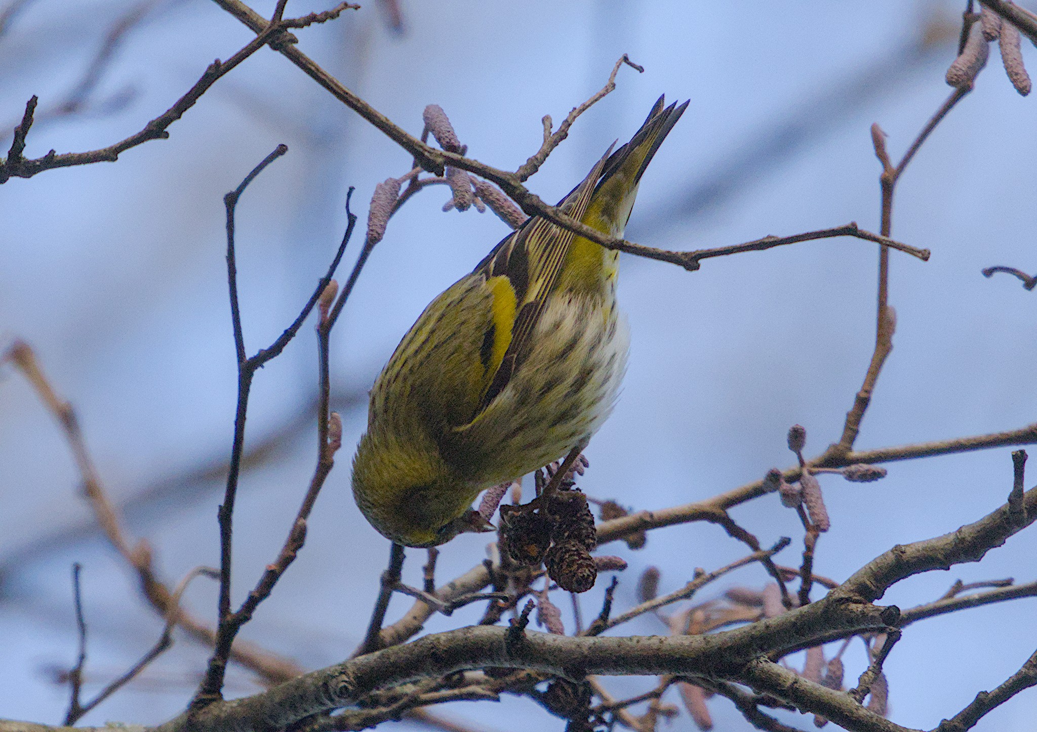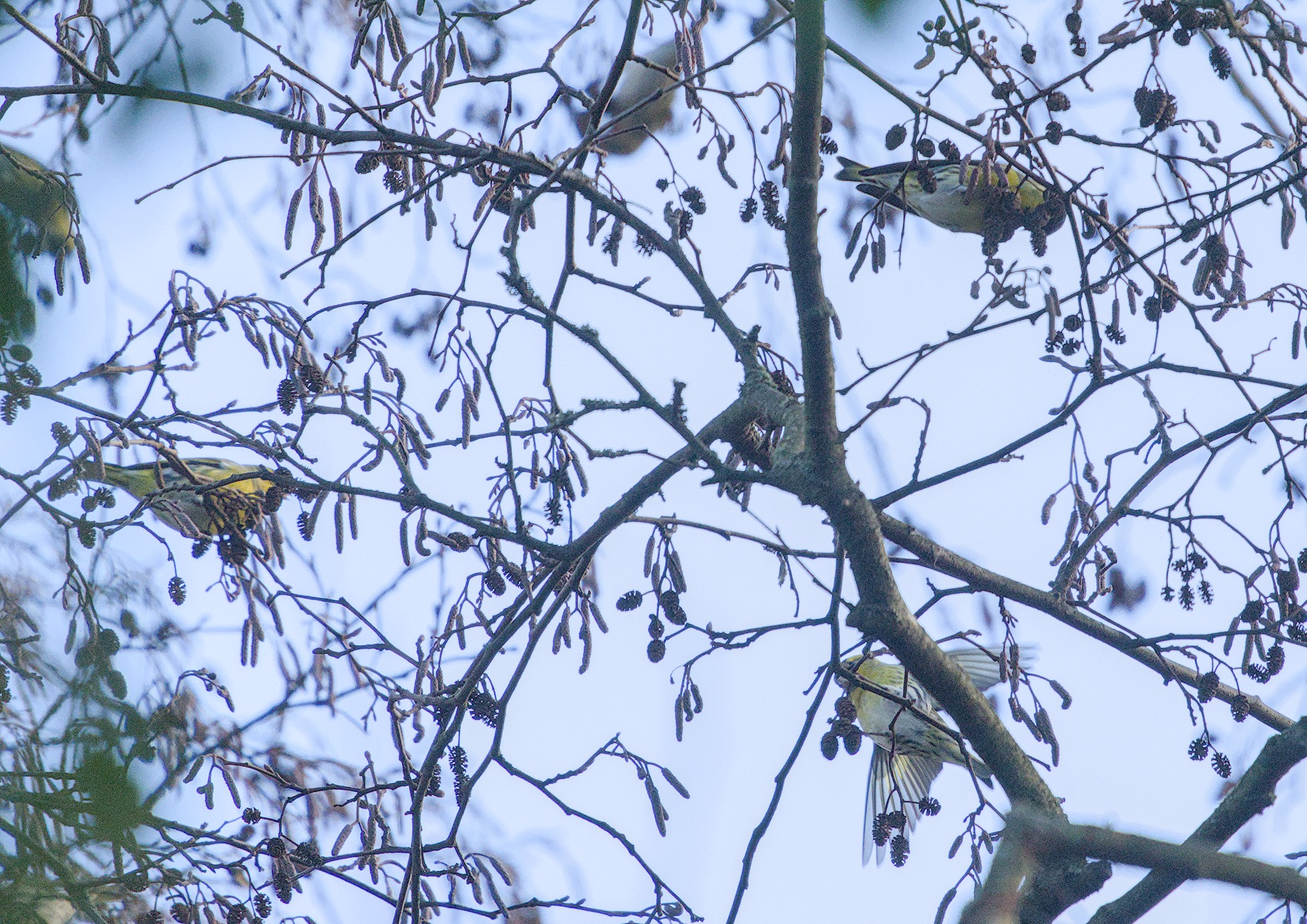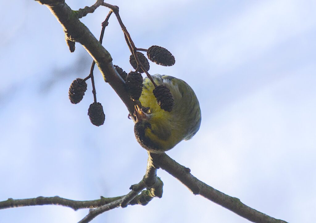 Several times small flocks of Long Tailed Tits moved through the trees. The tail-enders passing those at the front continuously and slowly moving down river. A few minutes later a flock would roll through going up river. Several times one or two Goldcrest seemed to be moving with them. While watching one flock go through I spotted several bird silhouettes feeding on catkins high in Alder trees. They didn’t move on in the way the Long Tailed Tits moved. They swapped places back and forth, were sleeker, and had shorter tails. A closer look showed them to be Siskins. The light wasn’t good but I reckon there were about 20 of them in the few trees above me.