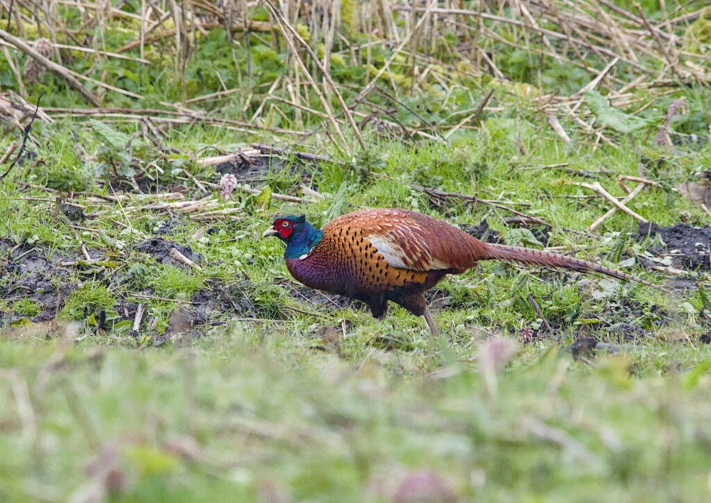 One of the surprises of my visit was to spot a pair of Gadwall again. I was able to show them to Steve who seemed pleased with the sighting. They are really a flooded gravel pit inhabitant so it is strange to see them on the river. Across the river on the other bank a male pheasant was wondering along eating as it went. I didn’t spot a female today.