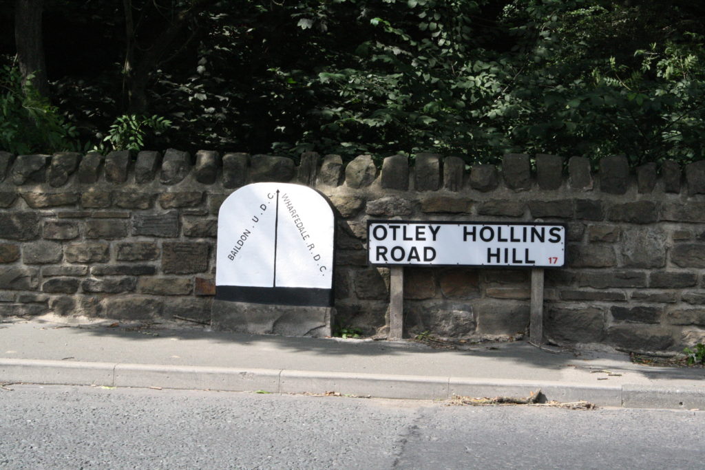 The beck marks the Baildon boundary and this stone on the bridge at Otley Road shows the boundary between what was Baildon Urban District Council and Wharfedale Rural District Council. The photo was taken in 2009 soon after the painting, funded by Baildon Parish Council, of the stone mile and boundary markers along Otley Road had been done.