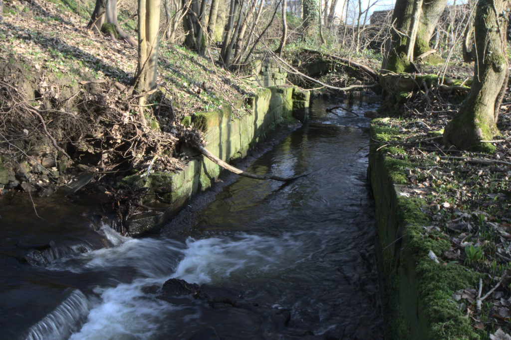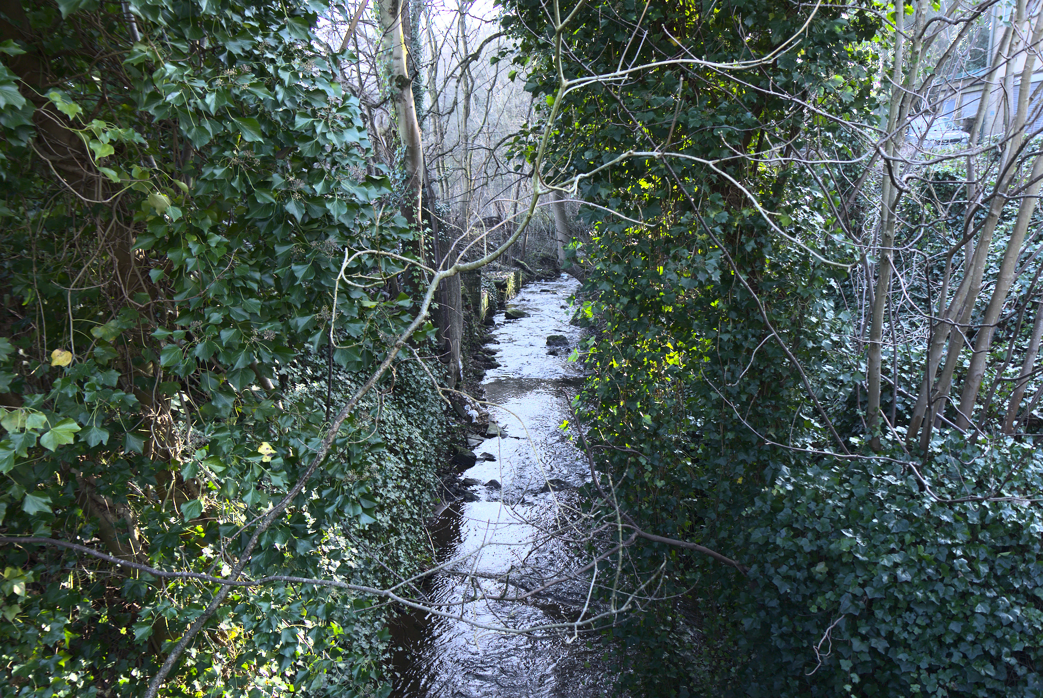 Not far upstream the beck emerges from having been under Tong Park Industrial Estate. The 3rd photo above is taken from where it reappears.