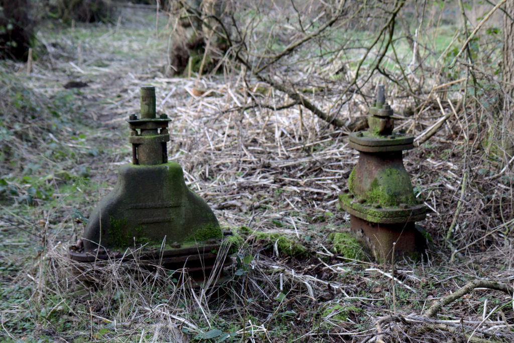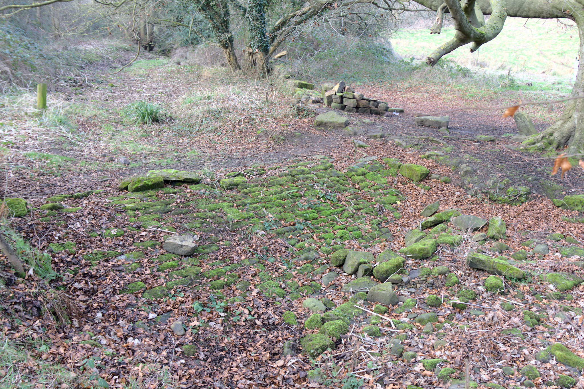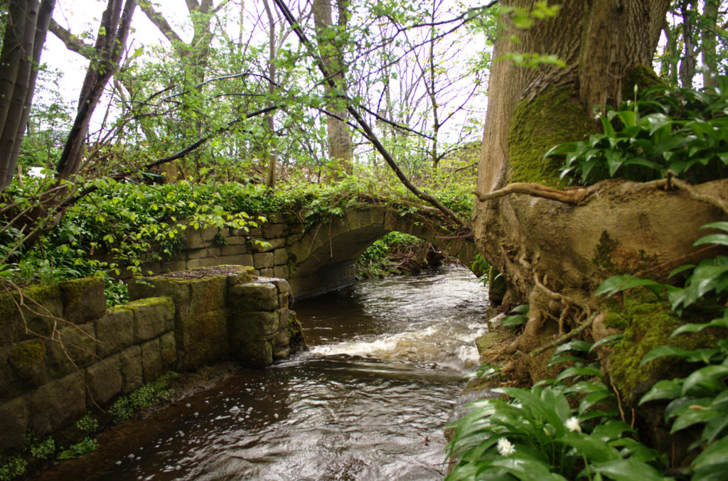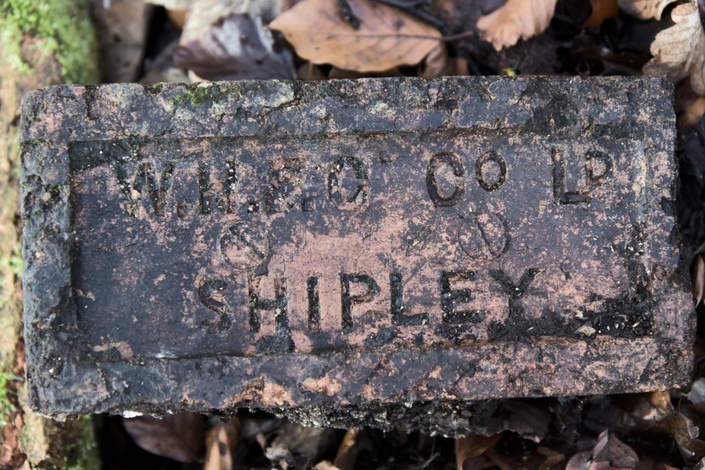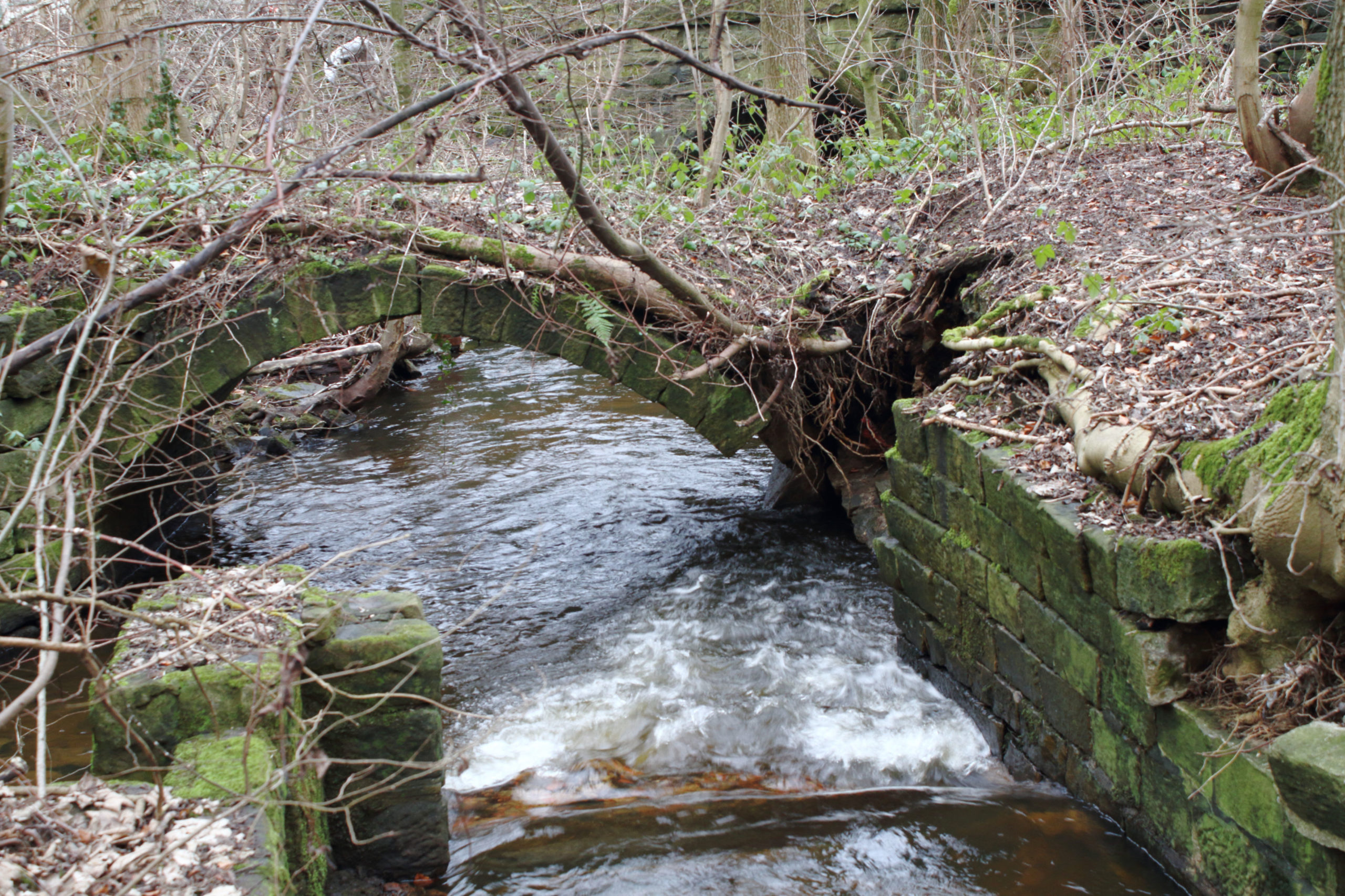 The photos above show some of the things in the immediate area of the stone bridge. I believe there used to be cottages in this area along with substantial stonework guiding the water flow. There is still evidence of a hearth, surrounding walls and also several bricks from local companies. The new wall on Otley Road now has a substantial grassed slope supporting it. At the top of a slope towards Tong Park one of the trees has impressive visible roots.