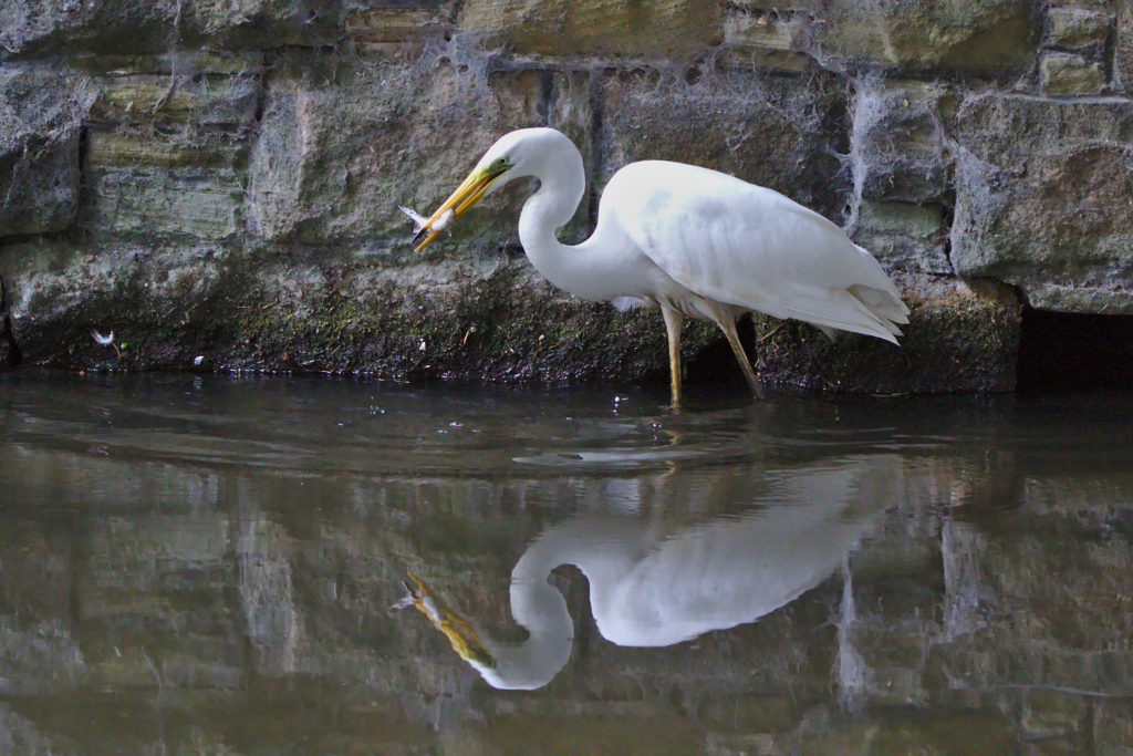 At one point it came onto the canal side between Are Jay Bargie and Titus but that didn’t give it any space when people came along the canal. It then flew beyond Are Jay Bargie and onto the other side again where it continued catching fish. By this time the light was fading and the Egret was in shade on the other side so I went down to the Boathouse for a drink and to wipe my camera down before walking back to Baildon Bridge and home.
