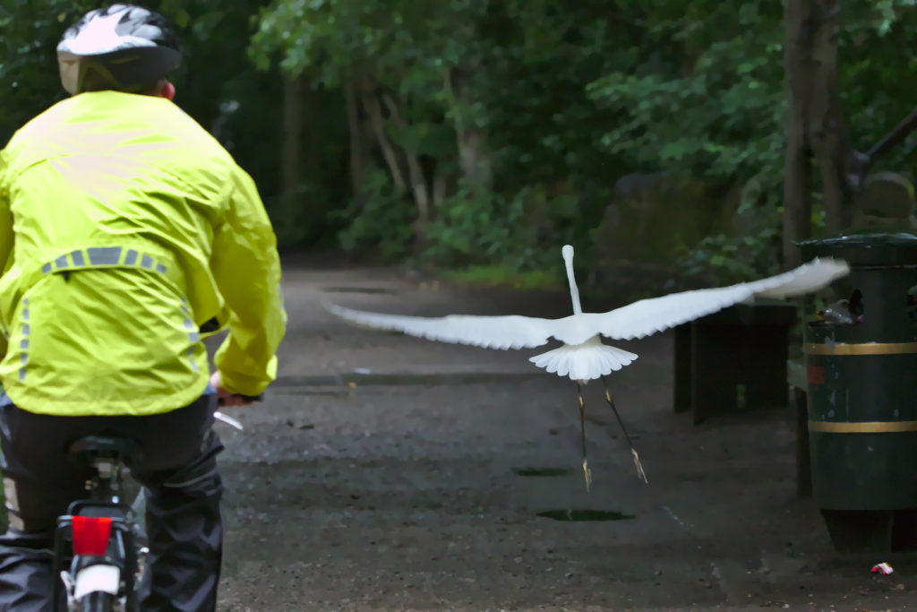 I started by looking at the weir at Baildon Bridge and then walked along the Shipley side of the river bank. A Kingfisher kept coming out of the trees in front of me and flying along the river. It was seeing me before I saw it. After getting up onto the canal side between Salts Mill and New Mill I decided to head towards Roberts Park since that is where the bird had been reported. As I got towards the Victoria Road bridge I saw a couple with umbrellas walking towards me and just behind them the flutter of large white wings.