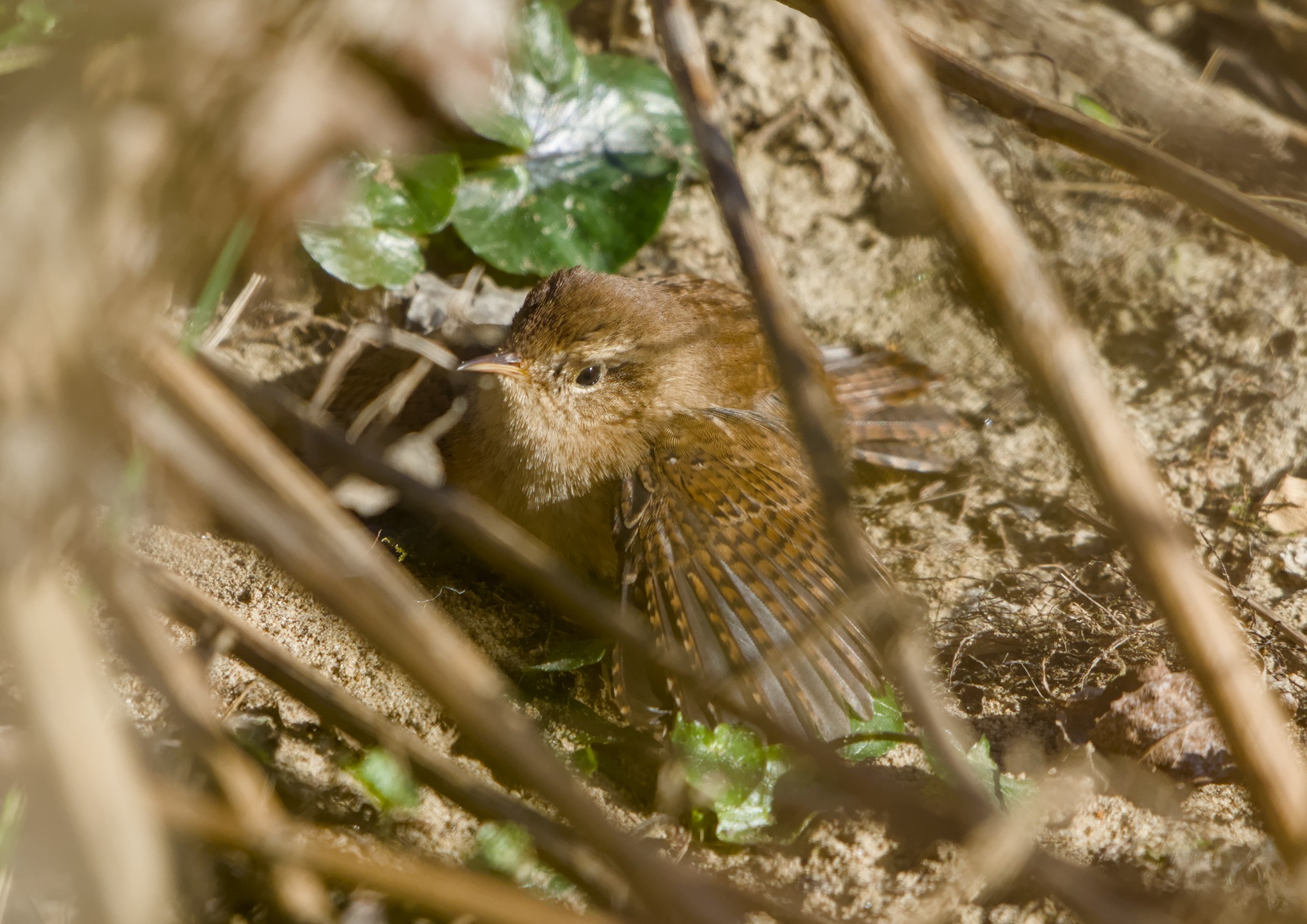 I was lucky to spot the Wren below one of the trees, wings and tail spread warming itself up in the sun (or is it exposing its feathers to the sun to encourage little creepy crawlies to leave it?)