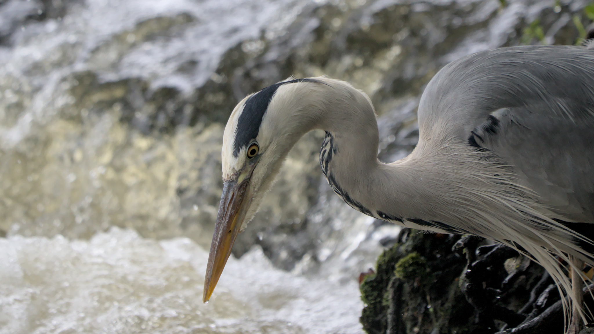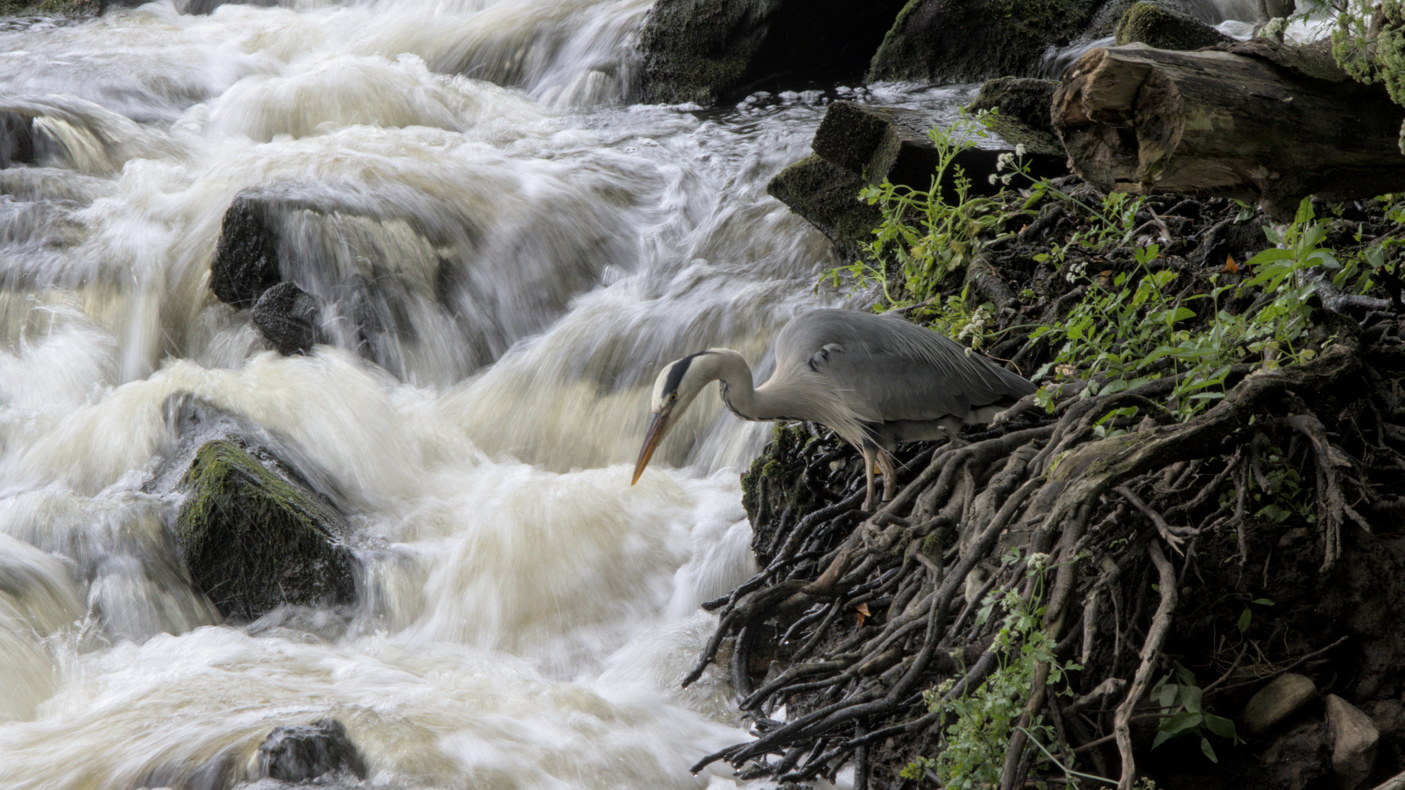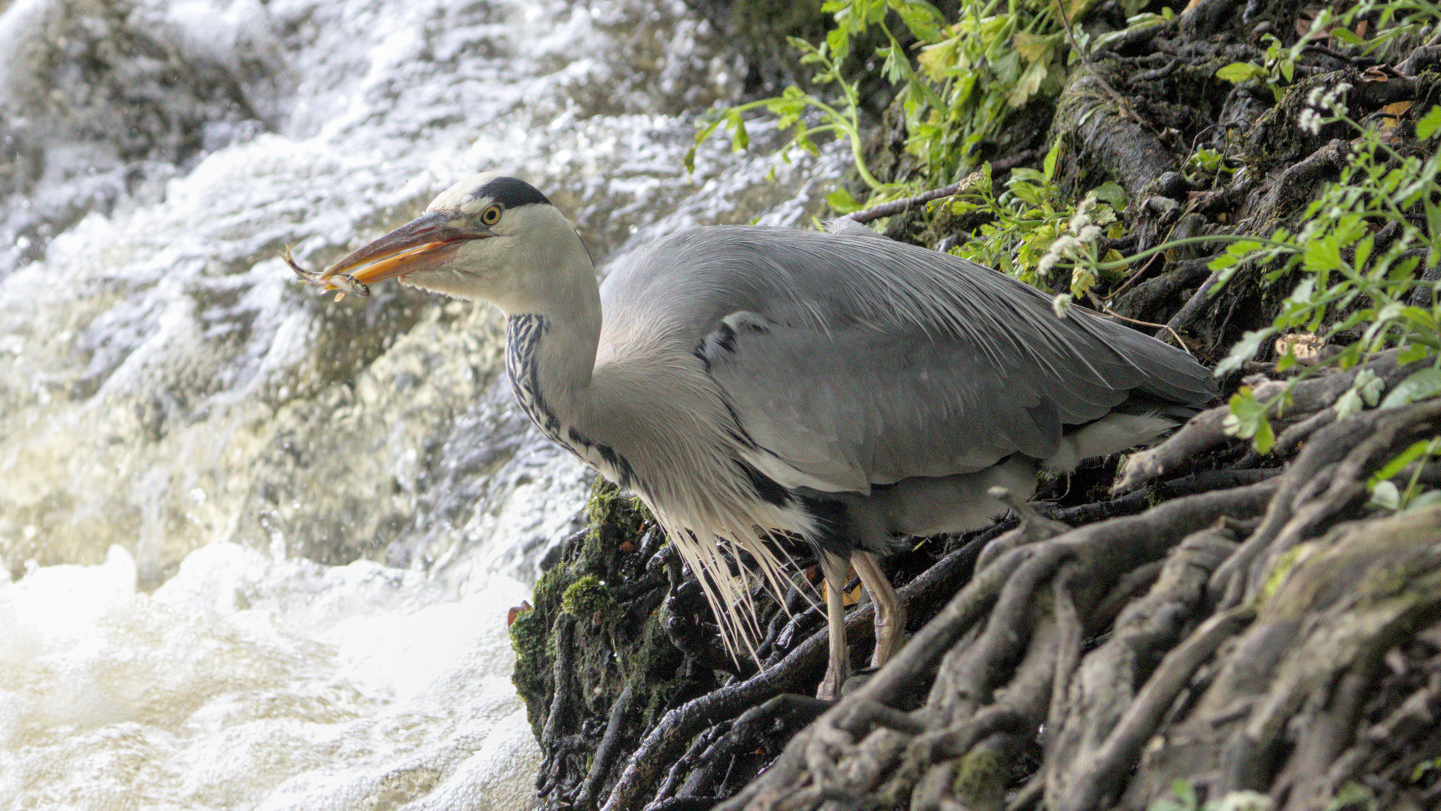 I was also watching a Grey Heron standing amongst some tree roots on the river bank just at the bottom of the weir. I don’t think it could see into the water and the fish it caught must have been on the surface amongst the froth and bubbles.