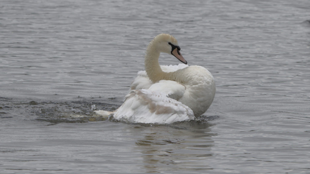 Several Swans were at the Tarn. Some of them looked as though they were getting their adult white plumage and were spending most of their time preening, rolling right over in the water and spreading their wings. As they spread their wings it was noticeable that some had much more developed flight feather.
