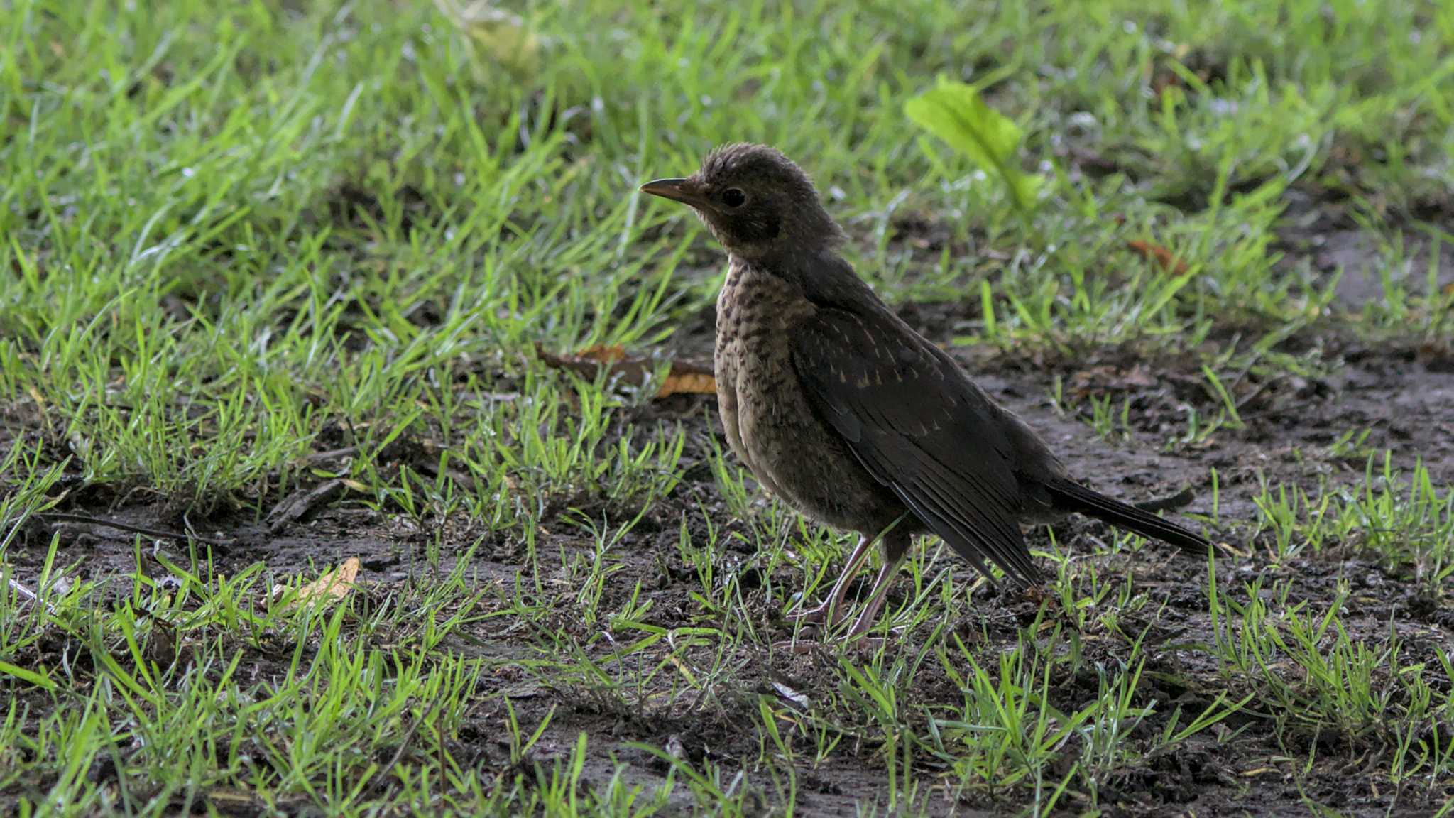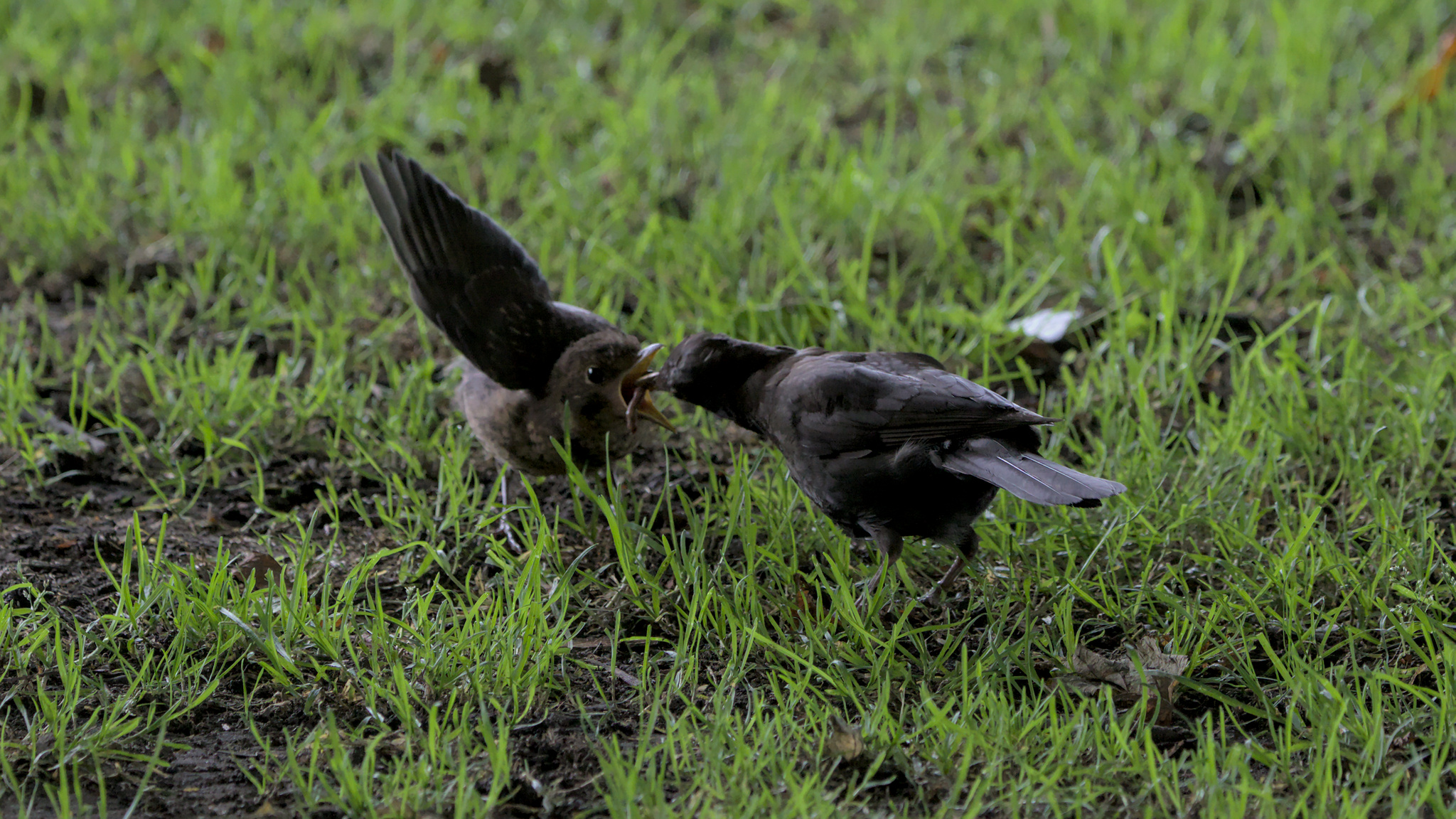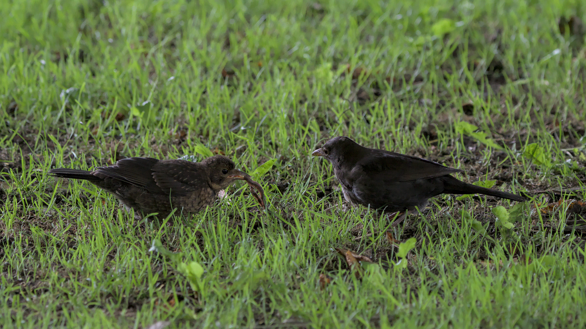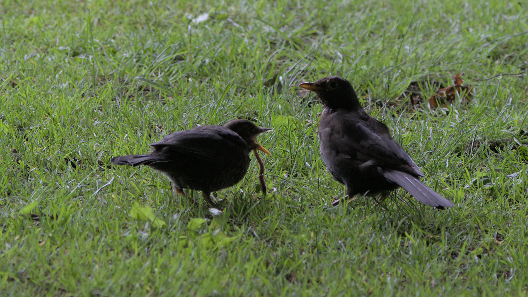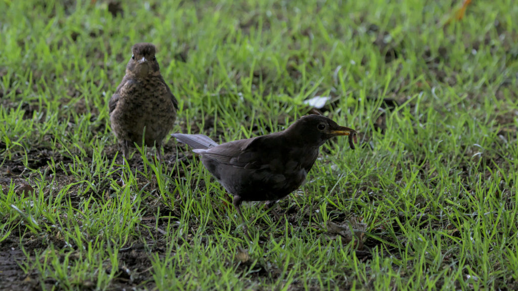 Young Blackbird being fed and taught by male adult. Yeadon Tarn