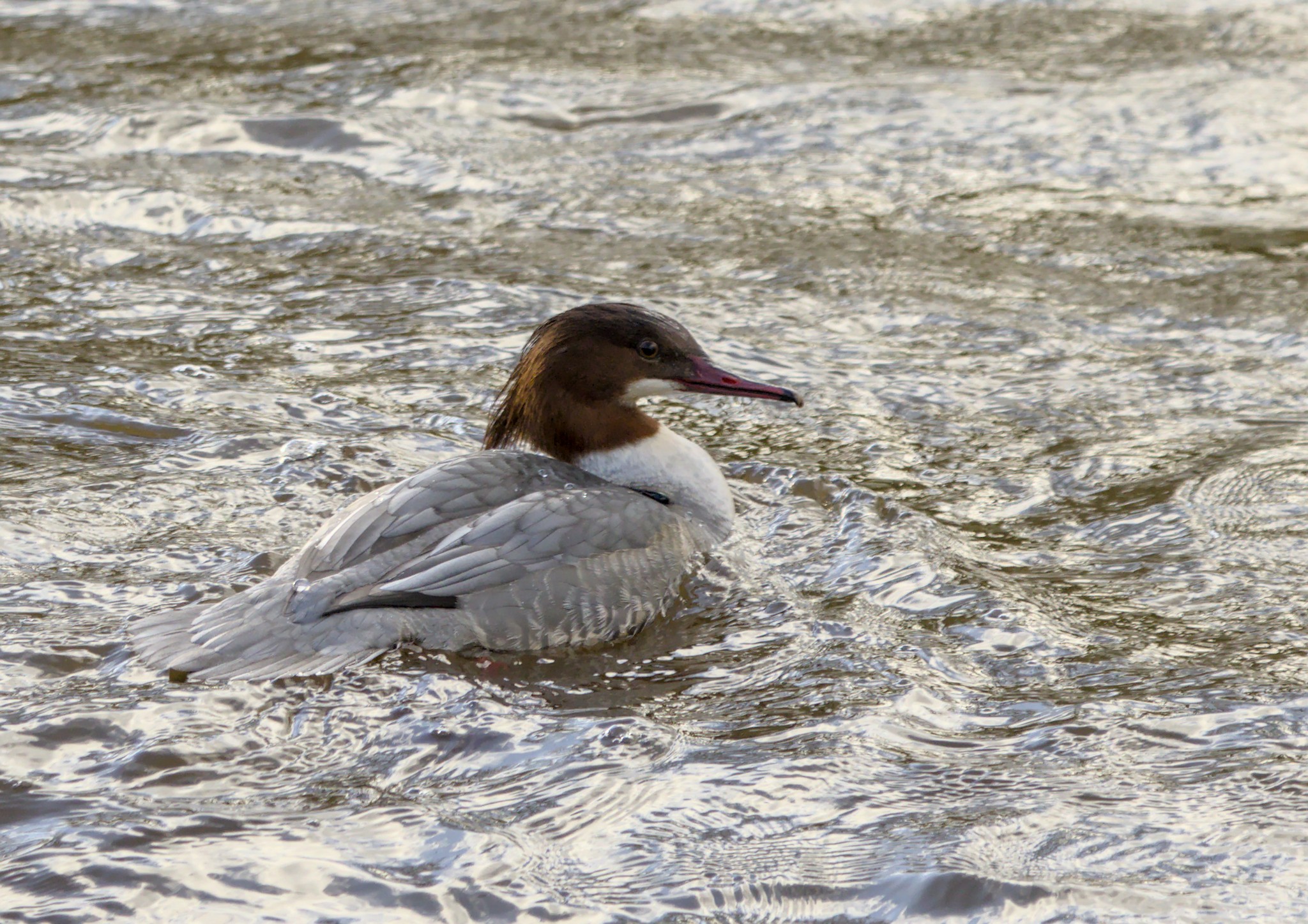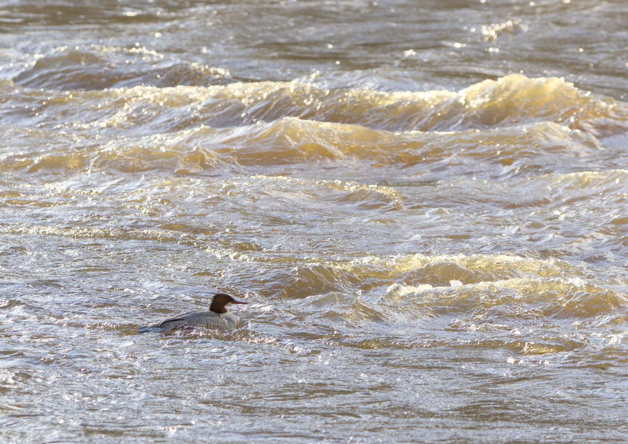 We have had Redwing in our garden again this year. They eat the berries on next door’s tree, fly to the tops of the trees and also rummage in the leaves under our Viburnum. The Great Tit, Bullfinch and Squirrel were near the Spider Club feeding station at Denso. The river is high and fast at the moment but the Goosander still venture out into the middle of it. This was taken from the Buck Lane footbridge.