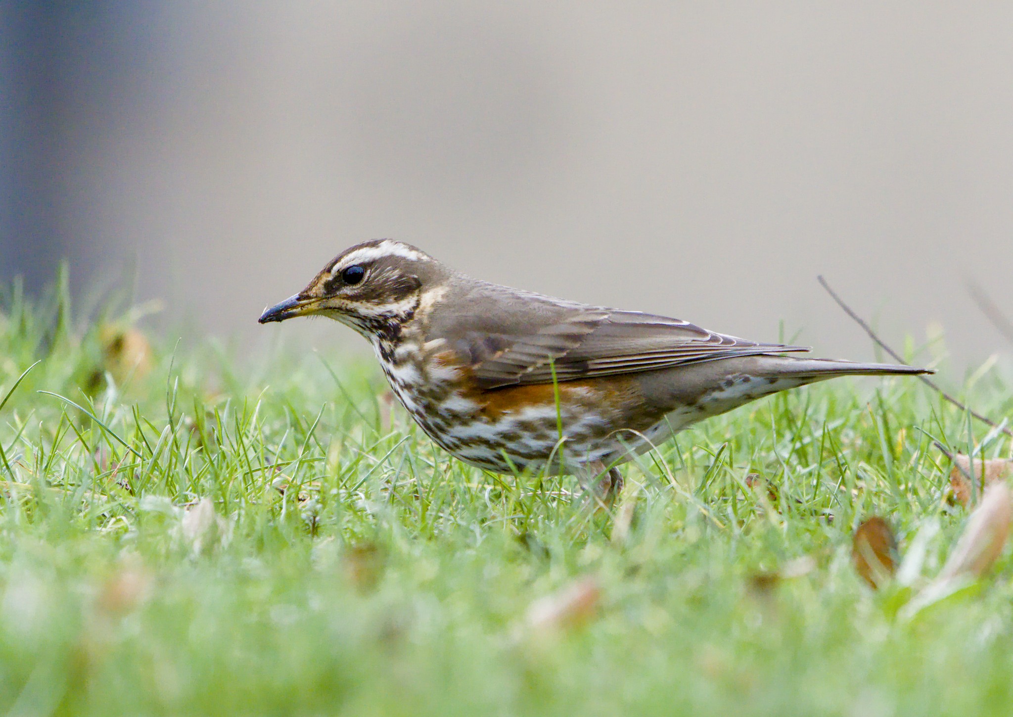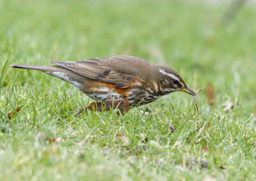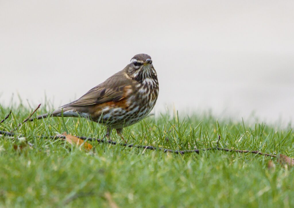 While walking along the river I did hear a Kingfisher but didn’t see it. In Myrtle Park I saw a noisy flock of Starlings but they were way up in the trees. Towards the end of my Bingley visit, heading back to the start, I spotted some birds on the grass at the junction of Myrtle Place and Main Street. Surprise, surprise, right next to the main road through Bingley were Redwings.