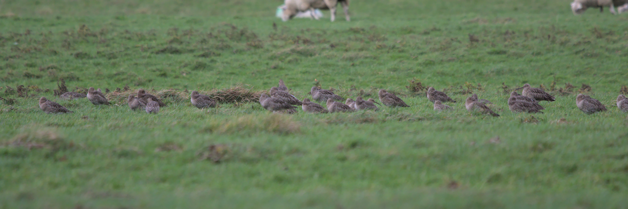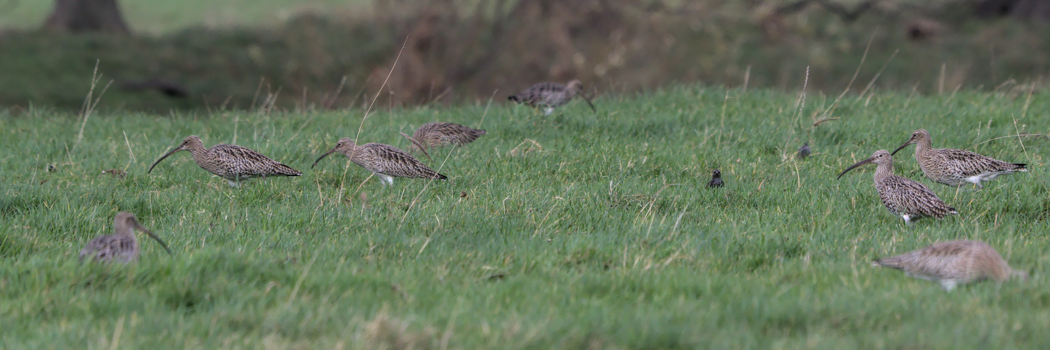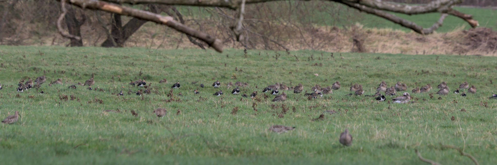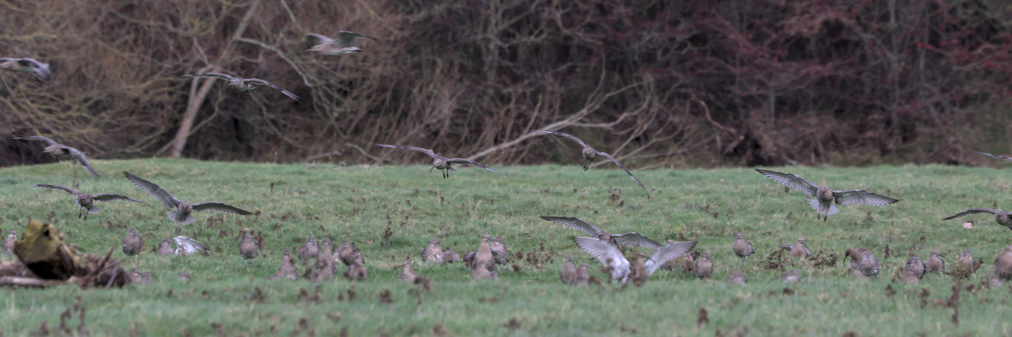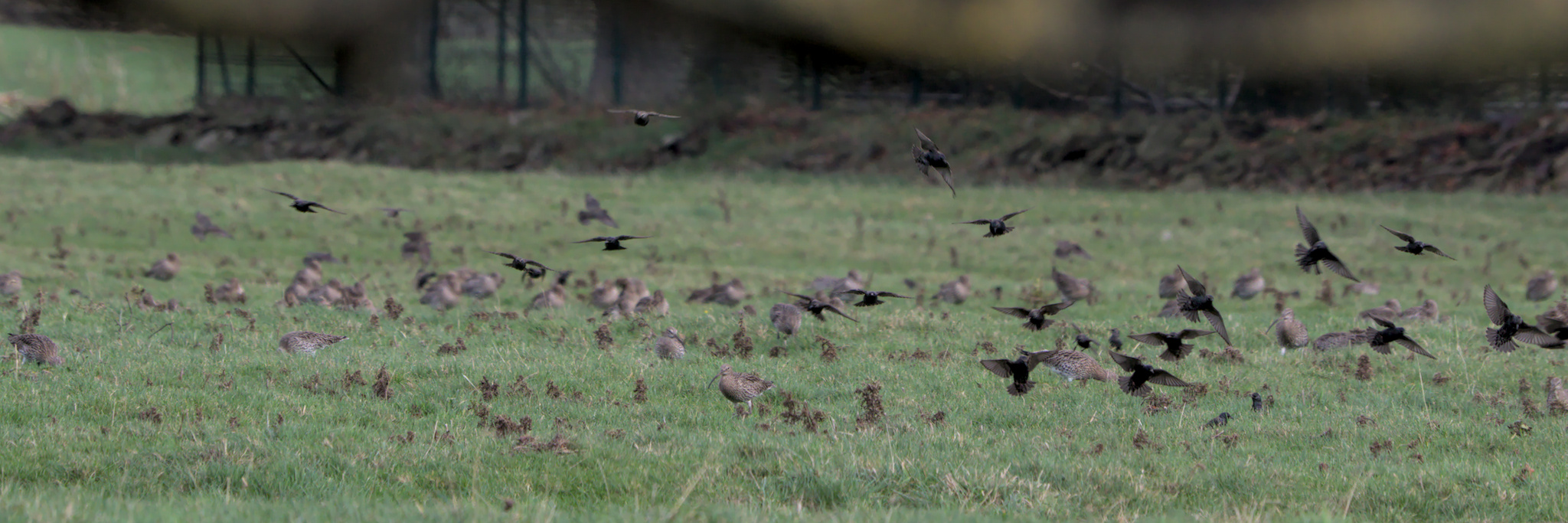 I could hear Robins, Long Tailed Tits, Gold Finch and Blue Tits but one of the first things I spotted was a flock of Starlings swirl around and land in the field over the other side of the wall. After looking a bit closer I realised that what I had thought were brown plants and grasses were Curlew, lots of them. Dozens of Lapwing were also with them. After watching for a few minutes most of them took to the air, circled round a bit and landed in the field across the other side of the river.