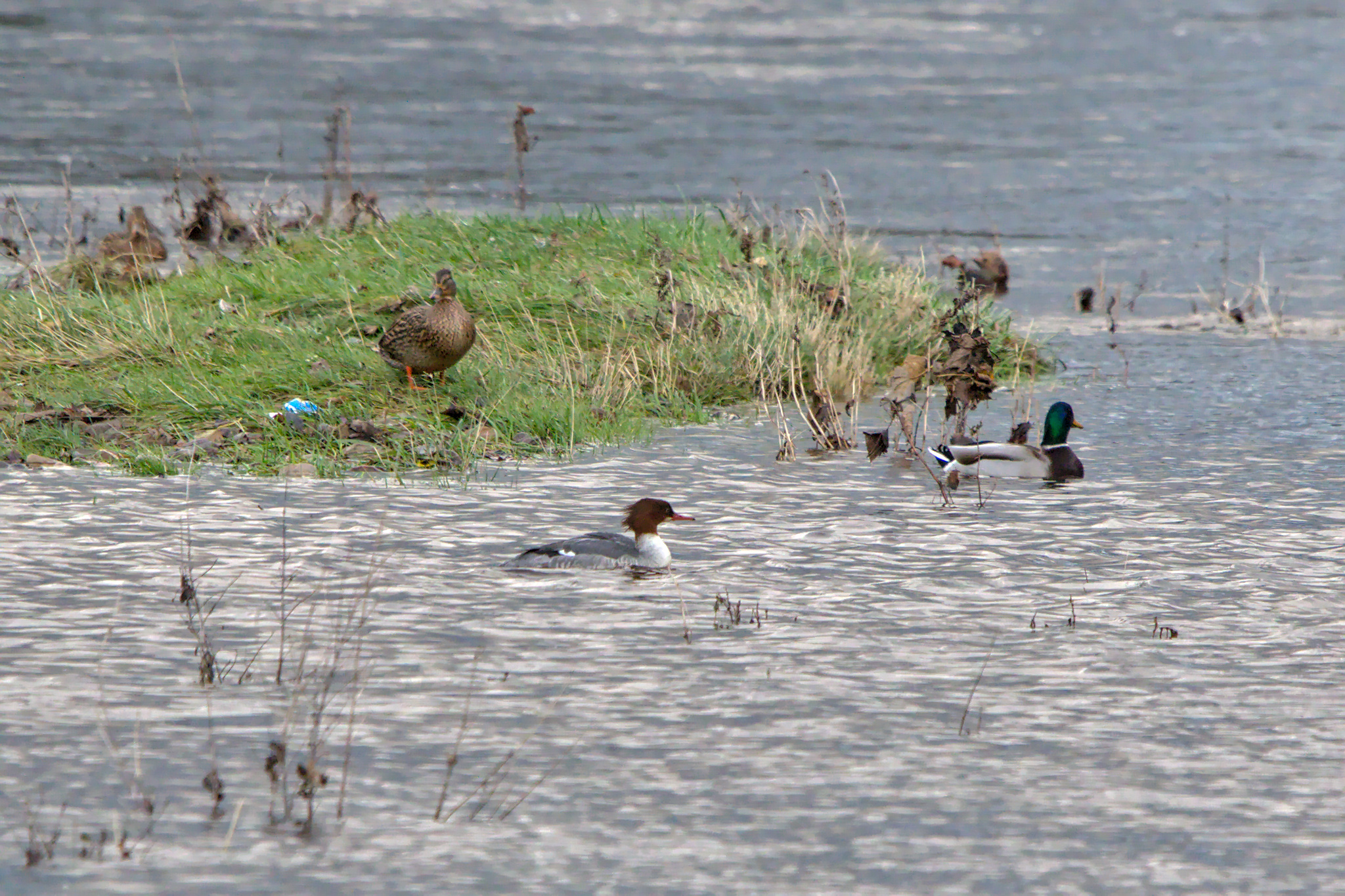 I didn’t have my binoculars with me but took some photos of ducks way down river. Some of them flew up river but I waited until I got home to look at the photos to see that there were Goosander among the Mallards.