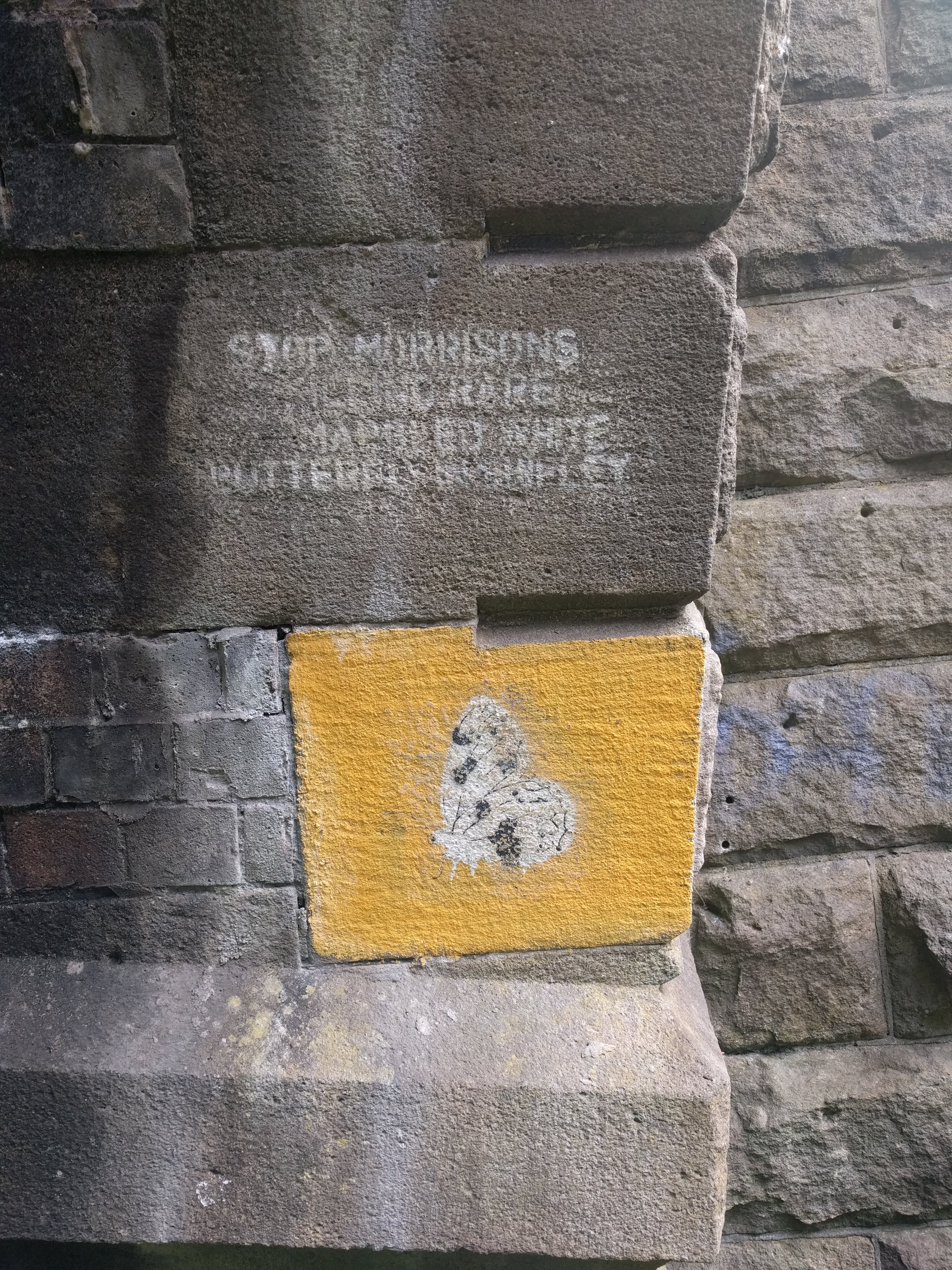 I didn’t spot any Common Blue butterflies so I decided to go over to the field on the other side of platform 4. You can get to it by going under the bridge on the left of the road into the station. On the way there I spotted this graffiti. “Stop Morrisons killing rare Marbled White butterflies in Shipley”