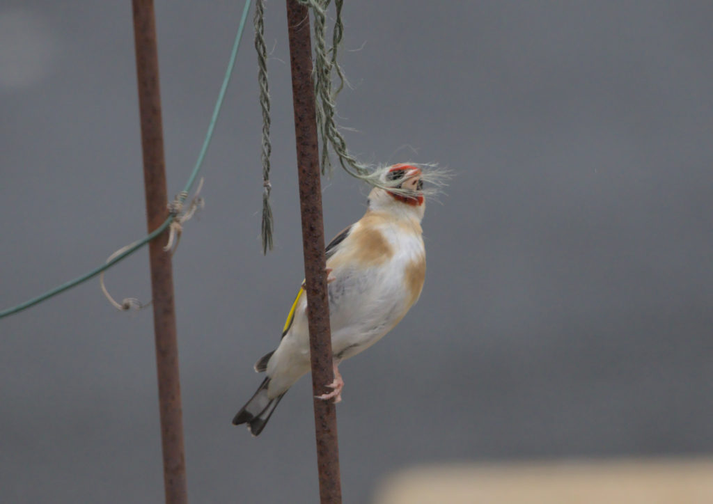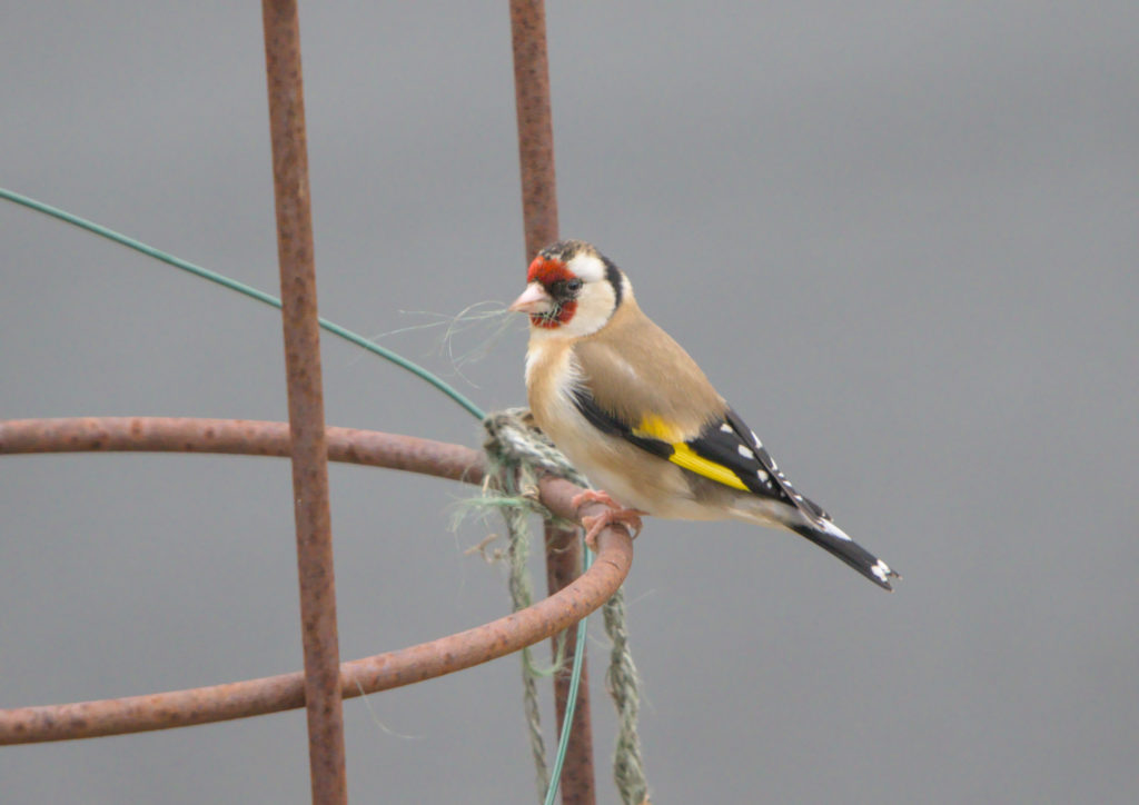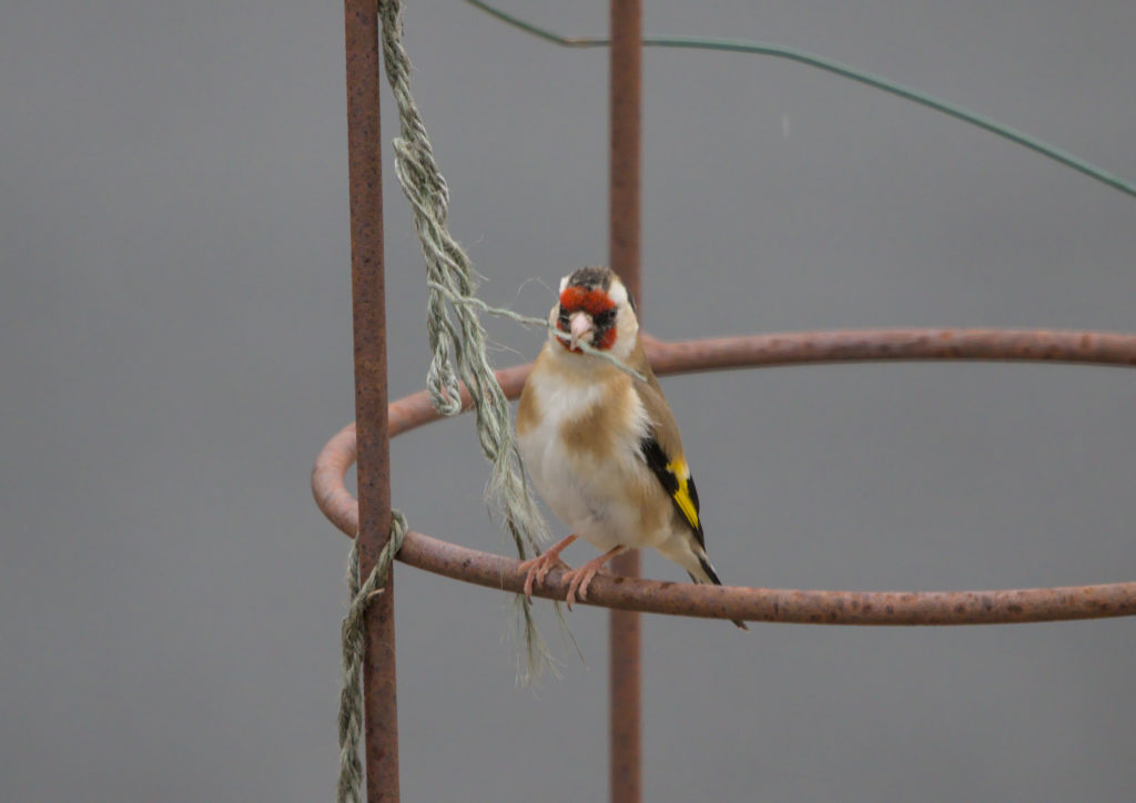 We have a small obelisk in the front garden that last year was used for Sweet Peas to grow on. The twine and wire is still on it and this year it looks as though Goldfinch are trying to get some of the twine to use in their nests. Last year I saw them getting blades of grass, this year it will take them a few visits to get enough twine for a nest.