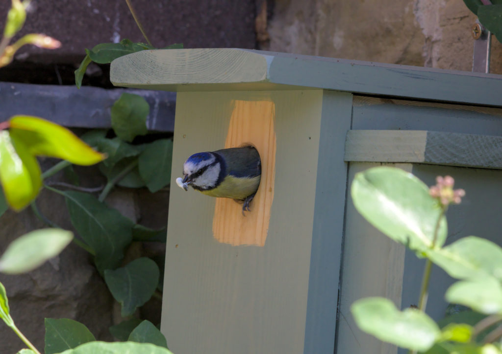 Our nest box with the internal camera is still visible, it has not yet been hidden by the Clematis. The parents were busy feeding the young. The caterpillars seem to be much more nutritious compared to the spiders we saw in previous weeks. The chicks are growing fast and the parents are taking away, or eating, the obligatory faecal sack.