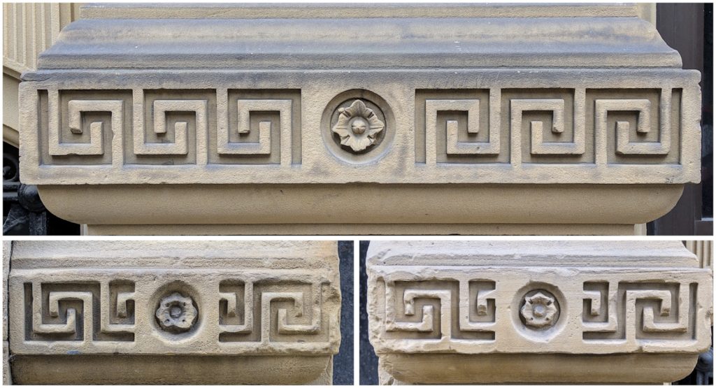 The carvings are in the stonework of the Bradford Chamber of Commerce building, Devere House, on Vicar Lane. The longer carving is one near the windows and looks quite fresh. The other two are either side of the archway and have had their edges bashed by numerous bins and carts over many years.