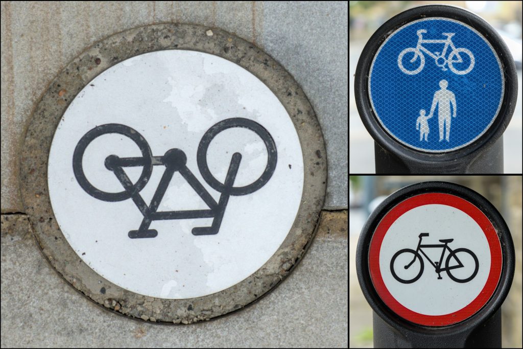 The cycle lane on Hall Ings is edged with lots of small bike symbols. When I first noticed one it was upside down to me and I couldn’t work out what it was. Is it an advert for an optician? Is it a plug for a Pilates position? No, it’s a bike with no pedals. Later I saw other signs showing a bike, these had pedals, but the frame geometries were different and the front forks had different shapes. They all have crossbars and old-style cruiser handlebars and they all point to the left. I had assumed that designs for road signs would be under more control. A bit of research shows that samples provided by .gov.uk guidance are of the blue style, some pointing left and some pointing right.