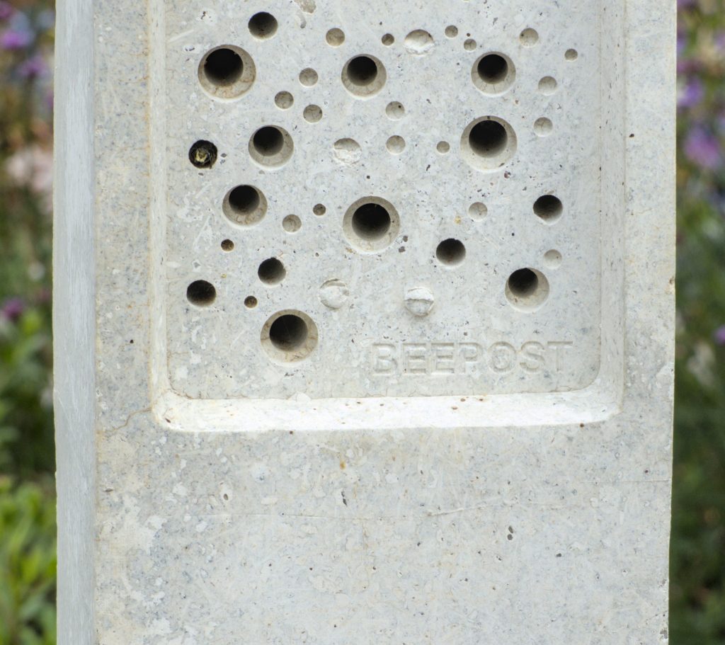 This is a detail photo of the concrete Beepost. You can see the head of a bee in one of the holes.