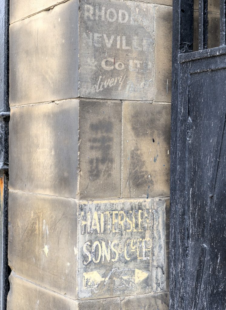 These Ghost Signs are on one of the gateways next to Britannia House on Hall Ings. Rhodes Neville & Co Ltd, Delivery Door and Hattersley Sons & Co Ltd.